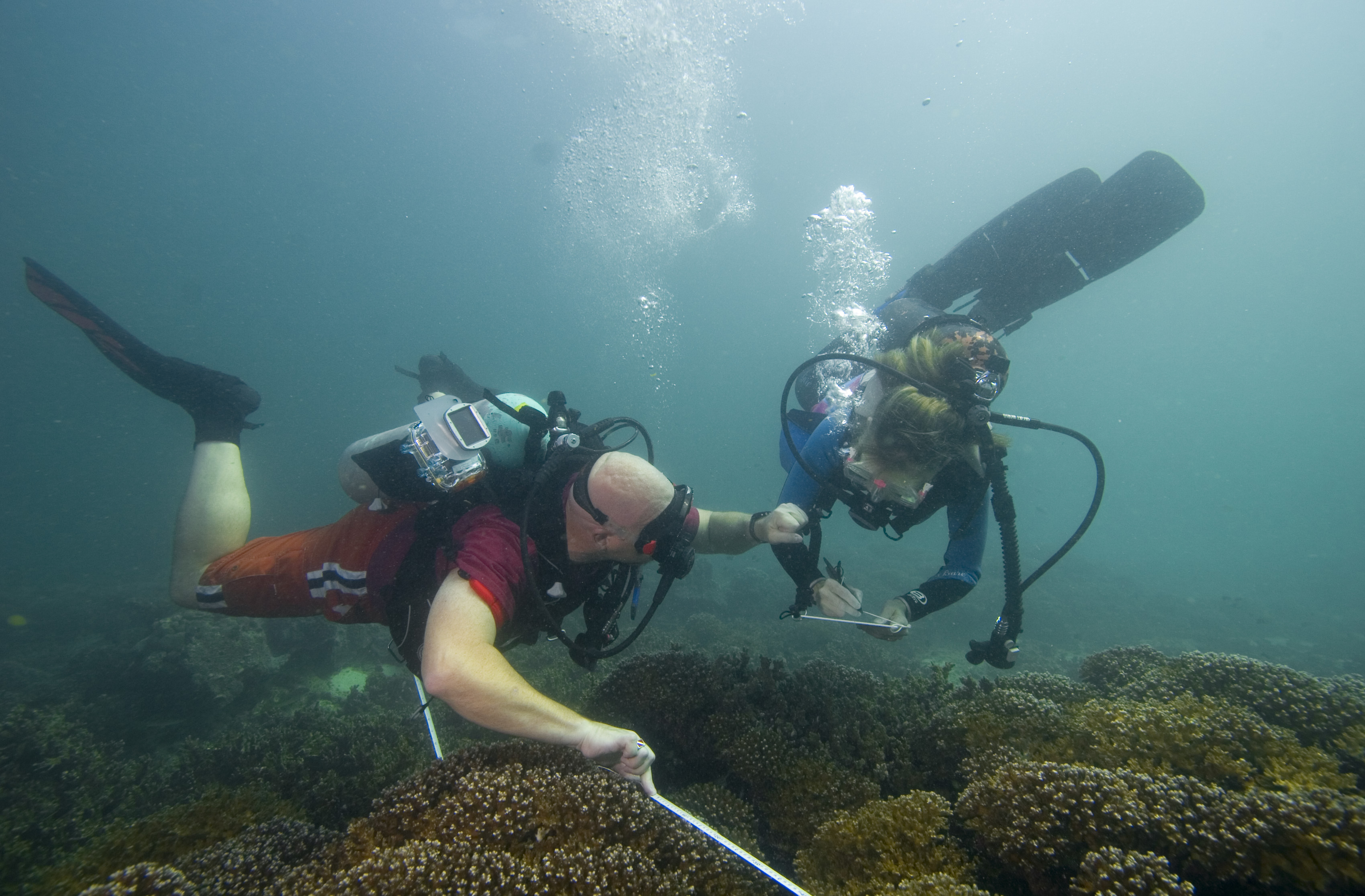 A team surveying a reef along a 100 m transect tape