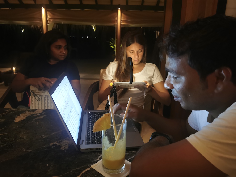 As the culmination of our two days of diving, we conducted a first survey of the Baros house reef. And what better place to record the data and celebrate certification than the beaches and the bar of this beautiful little island. The data confirmed my initial impression of a reef in recovery mode: good hard coral cover (38%), decent fish populations (with parrotfish and butterlyfish dominating, and groupers, sweetlips and snappers present), and very little coral damage such as bleaching or evidence of anchoring or pollution.I hope this is a good omen for the rest of our surveys. See you later today to find out.