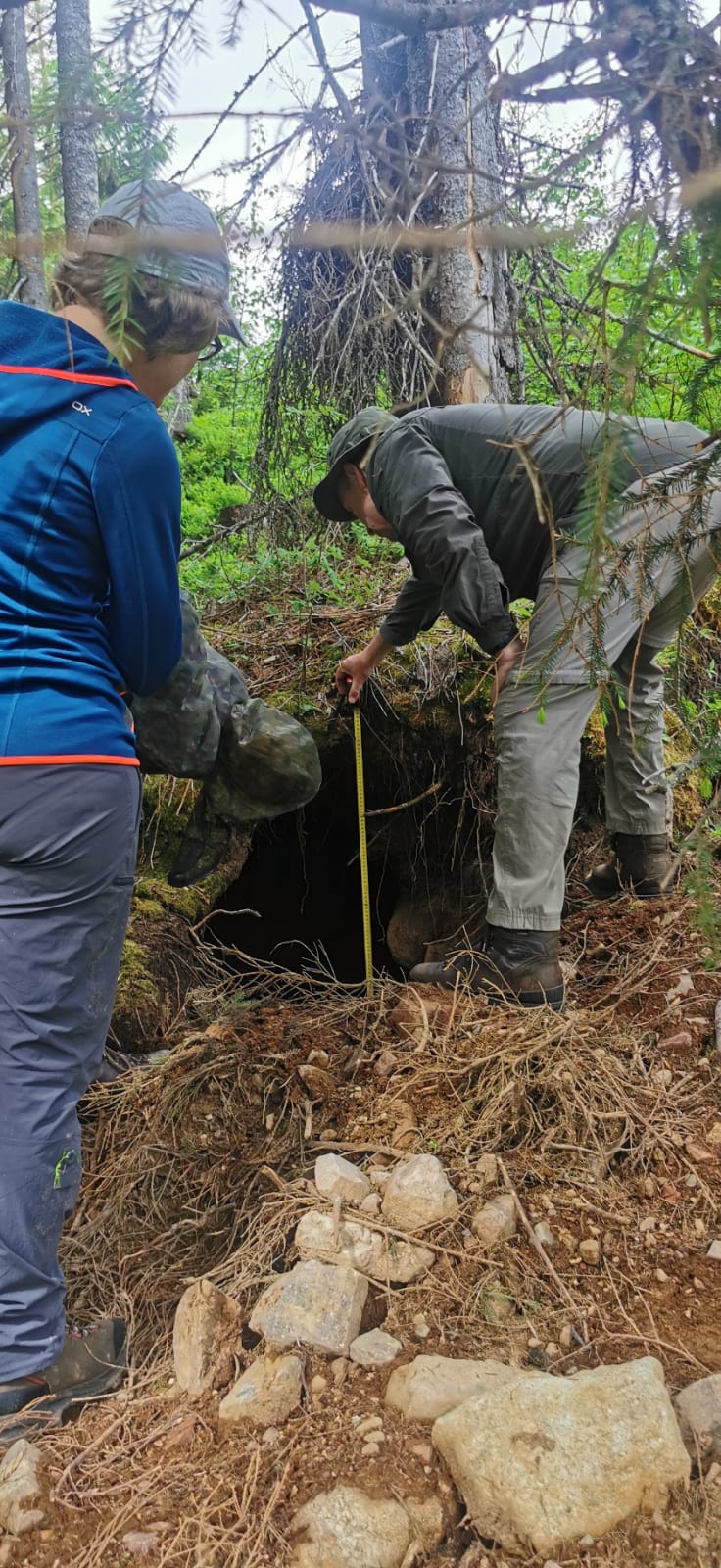 The main focus of the Biosphere Expeditions brown bear research expeditions is locating and surveying winter dens used by bears that have previously been fitted with tracking devices. Once the bears have left in spring, each winter den is then carefully measured by the citizen scientists and a wide range of data are collected relating to the type of den, the surrounding habitat and any evidence of cubs and/or bear scats at the den site.