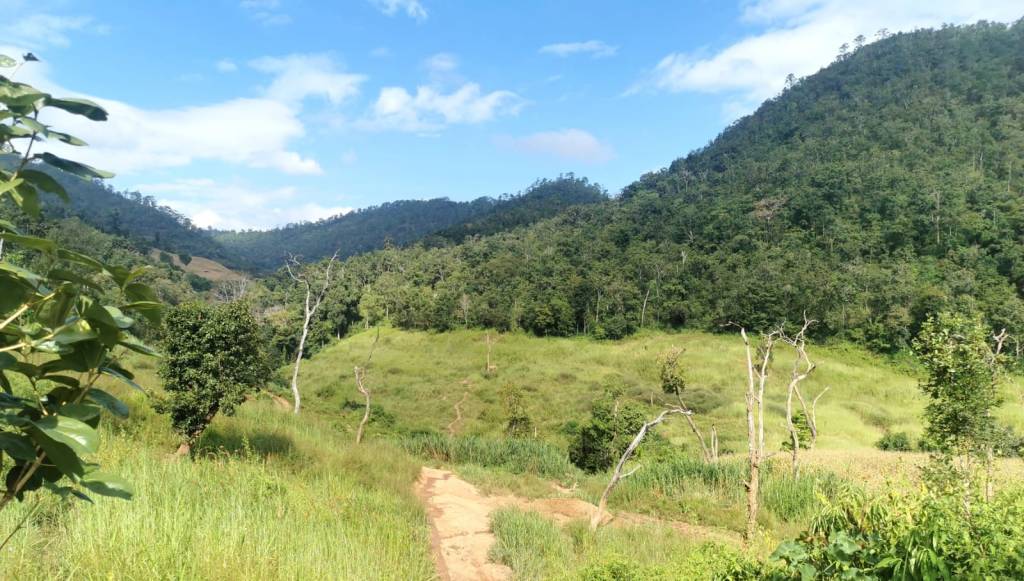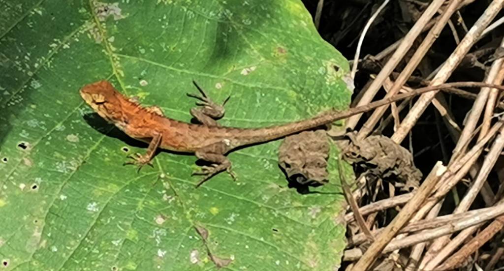 Most of the team managed to get some good sleep that first night, despite the unfamiliar nocturnal noises of dogs and geckos and the bustle of the village waking at dawn. We set off after breakfast to find the elephants. This involves a good hour’s walk over the bouncy suspension bridge, through the village, along the river bank, past rice paddies and corn fields and up towards the forest. There were plenty of insects, lizards and plants to distract us en route until finally we spotted the elephants half-hidden in a grassy field. It was a special moment to see five Asian elephants free-roaming and calmly foraging in front of us. The sixth elephant was the calf, ‘Junior’ who would have been somewhere near his mother or aunty – they tend to stick together as a trio – but hidden from our view in the tall grass.