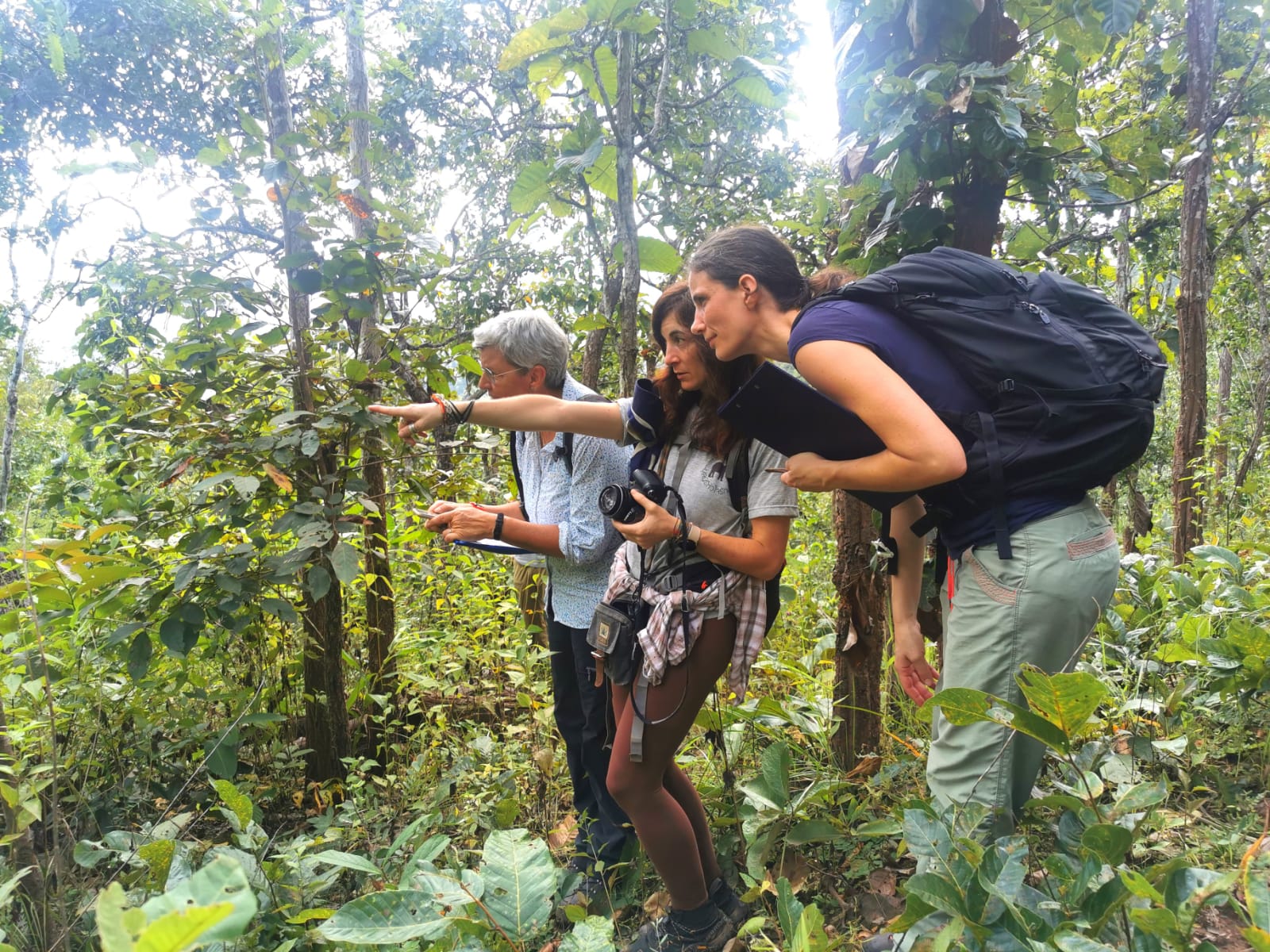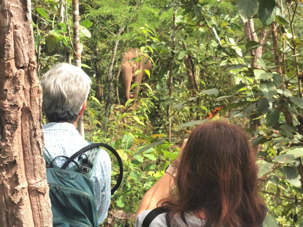We followed the herd as they wandered into the forest and at the first opportunity we paused and watched them from a safe distance so that scientist Laura could give us training in the field, putting into practice what we had learnt in the classroom the day before. It was very helpful for us to get a feel for how to carry out the research tasks when faced with the realities of observing elephants wandering around the forest, half hidden by the trees (or each other) for much of the time. It was a good reality check: conservation research is rarely neat, tidy and simple to do. And of course, it was an utter thrill to be up close with semi-wild elephants showing their fascinating natural elephant behaviour.