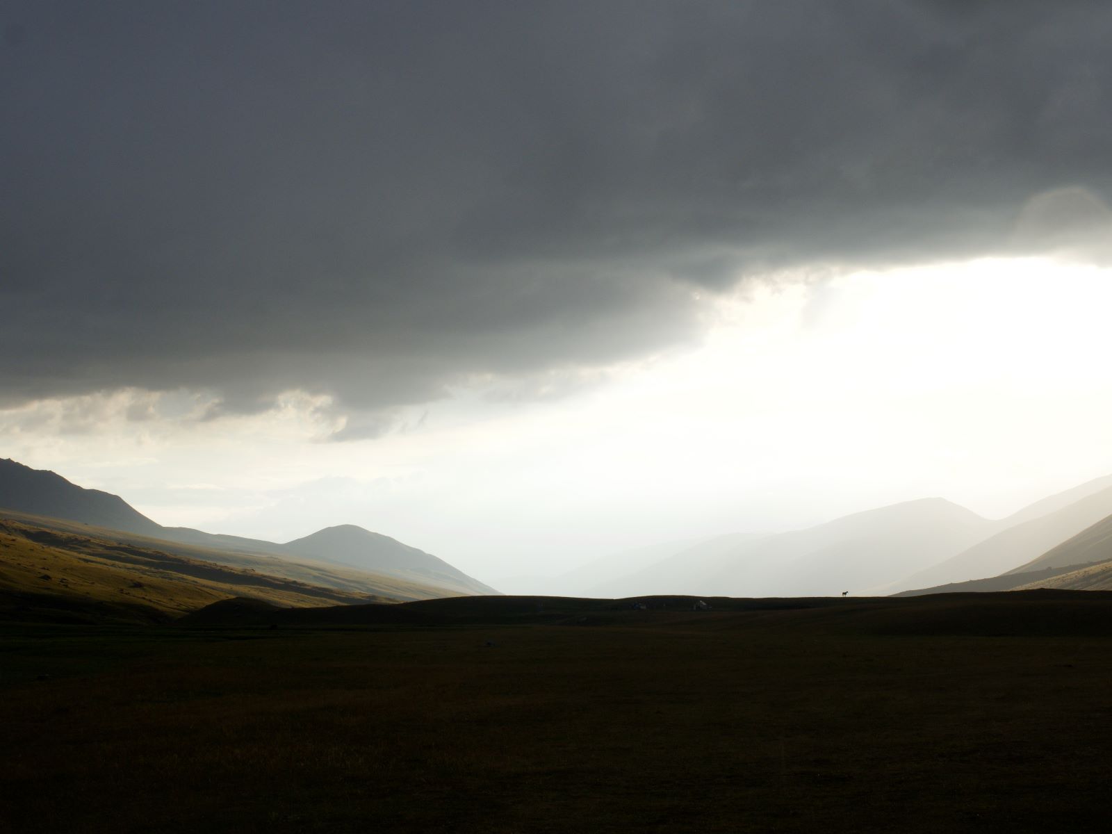 Freitags fuhren wir mit Ayan auf die rechte Seite des Flusses. Dort waren die Berge nicht so steil, aber die Tรคler dafรผr umso tiefer. Da das Tal tiefer war, war der Wasserstrom grรถรer und wir mussten sehr oft durch das Wasser steigen. Es fing dazu noch an zu regnen. Wir kamen leider diesmal nur bis auf 3700 m Hรถhe. Wir fanden wie auf jeder Tour mehrere Steinbockschรคdel, wurden von Bartgeiern beobachtet und sahen einen Steinadler.