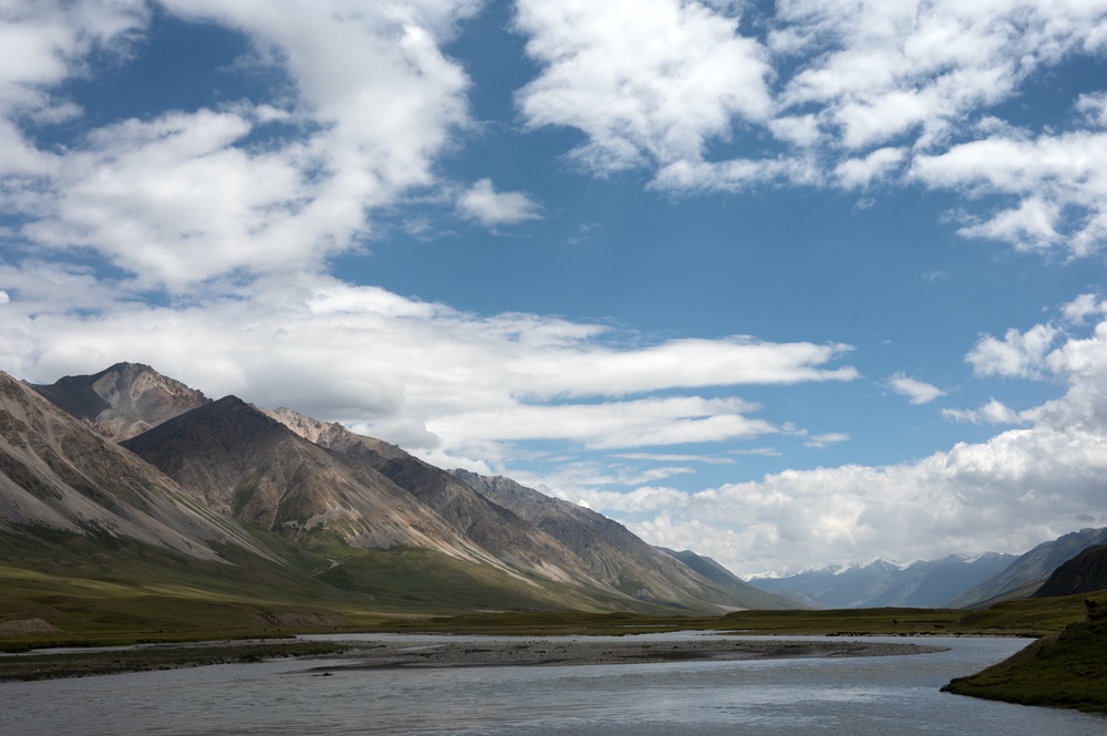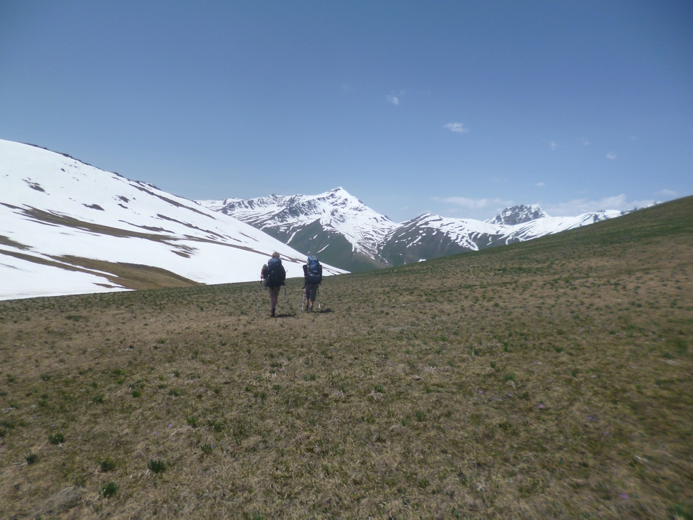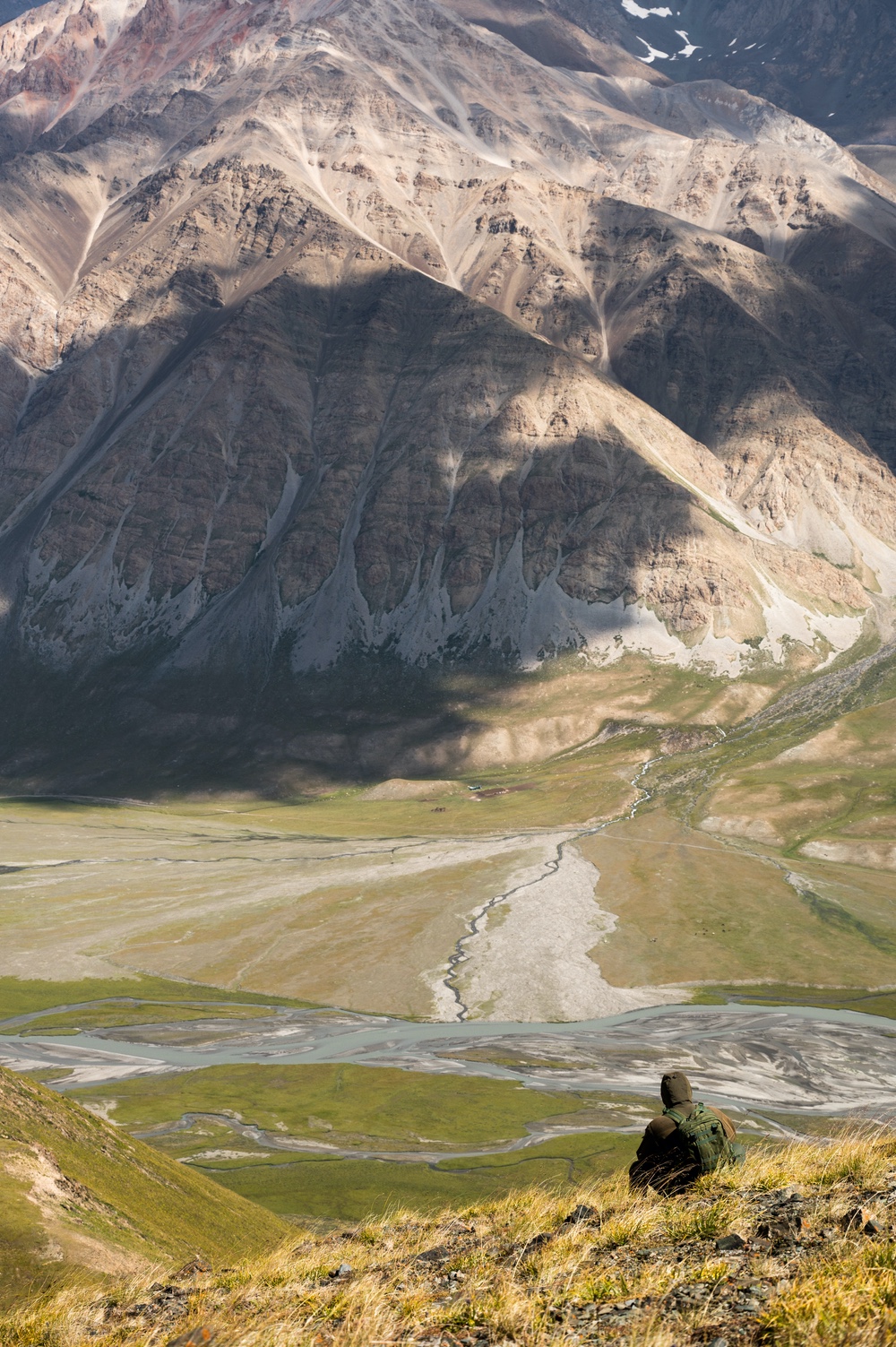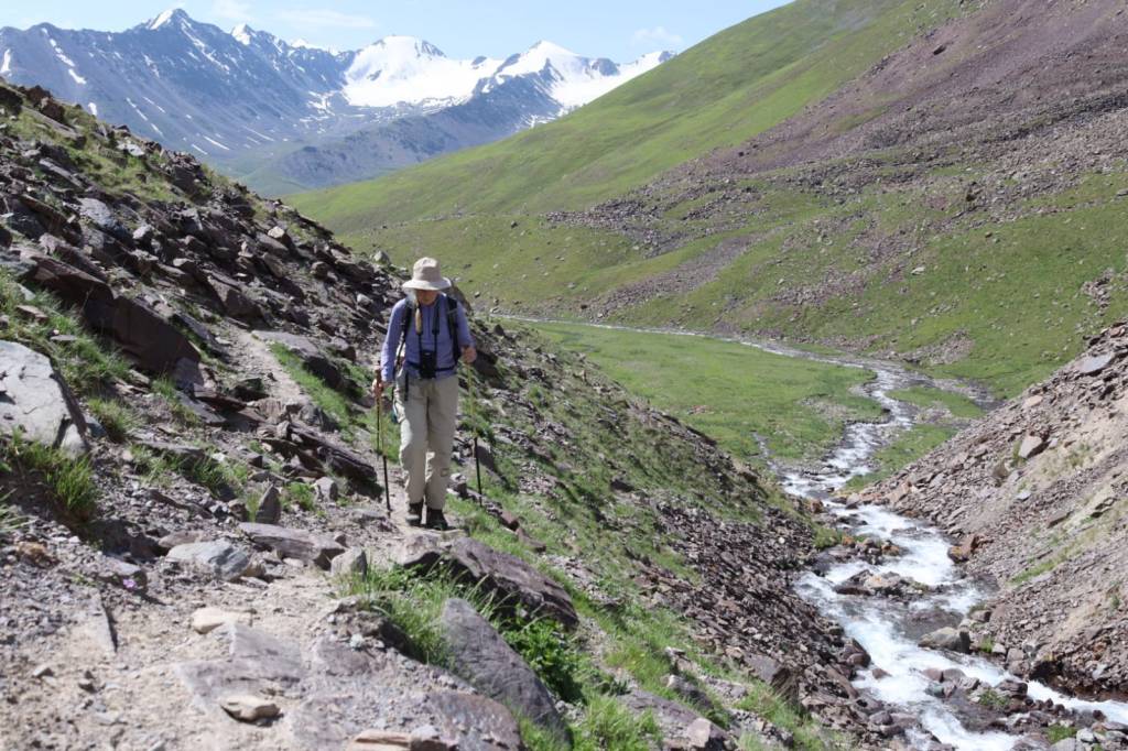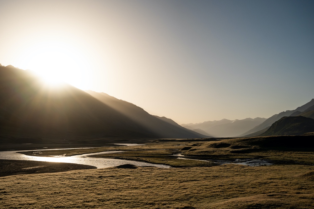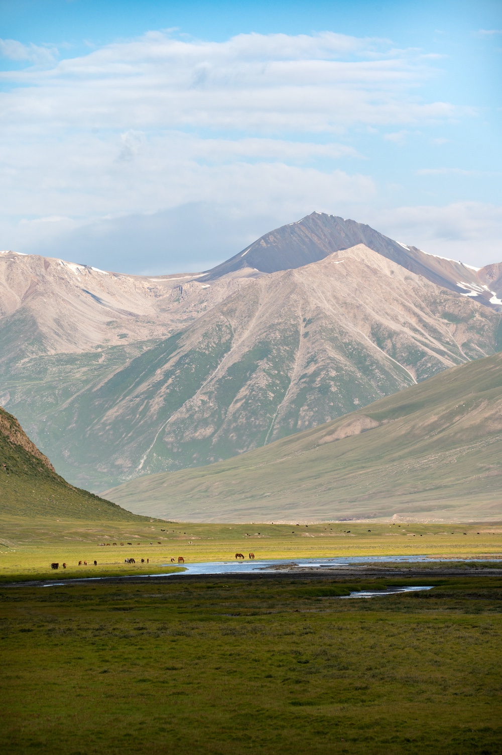 Ab nun begrรผรten uns jeden Morgen die 4200 m hohen Berge um uns herum. Nach dem Frรผhstรผck die Ausrรผstung gepackt und Ibrahim vom Team NABU sind wir dann zum Anfang eines Tals gefahren. Wir mussten unterwegs mehrere Wasserstrรถme durchqueren und trafen auf Rinder und Pferde. Wir brauchten fรผr die Strecke eine gute halbe Stunde, und dies wiederholte sich auf jeder Tour.
