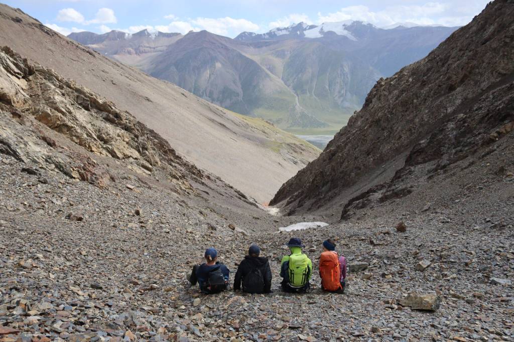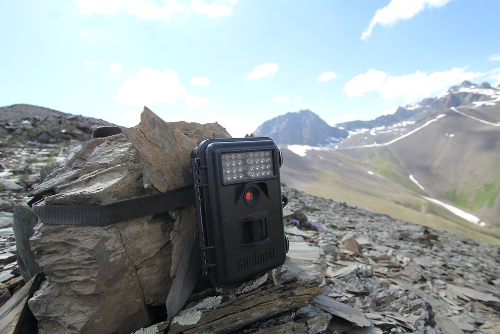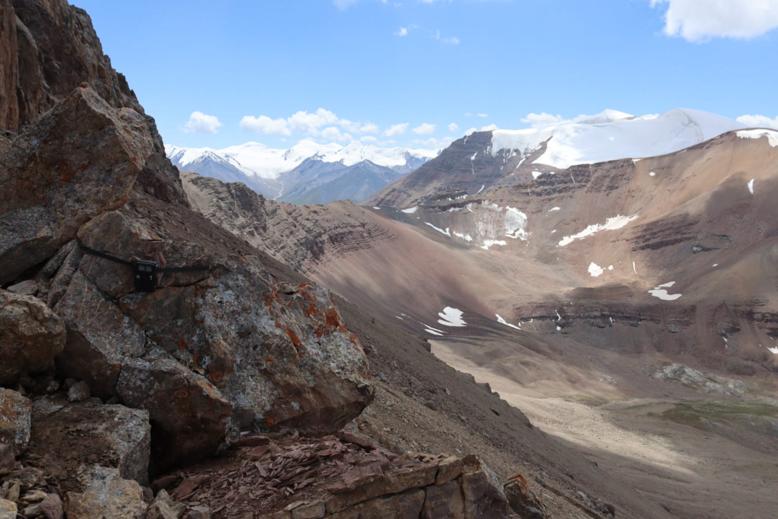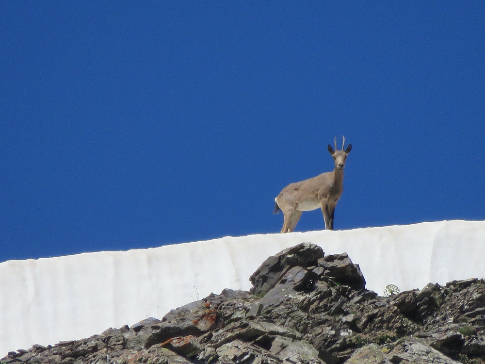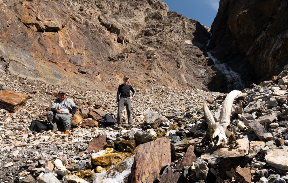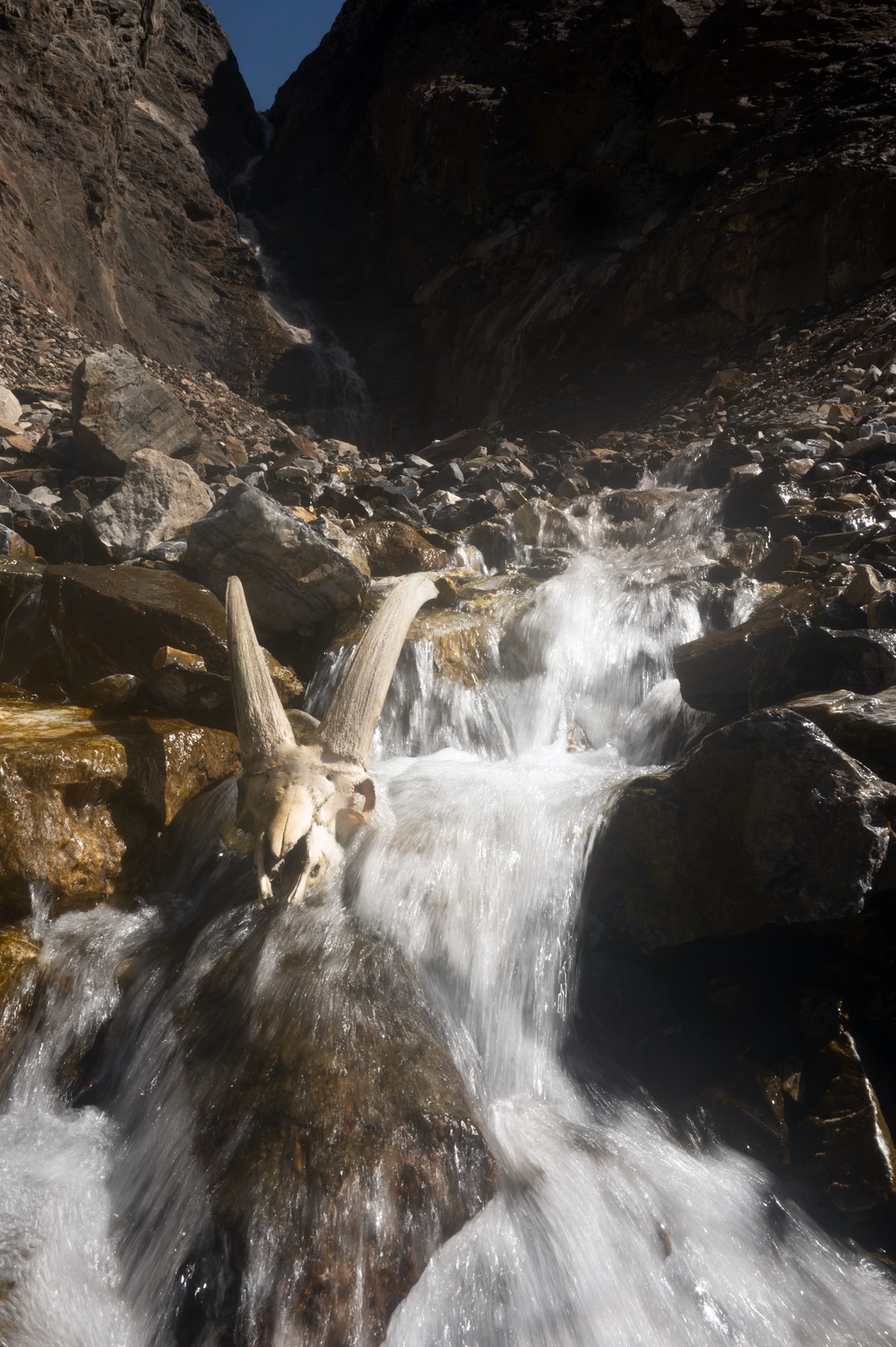 Am Seitental angekommen ging es fรผr unser Team dem Wasserstrom entlang Richtung Berg. Erst an dutzenden Rindern und Pferden vorbei, die im Tablet dokumentiert wurden. Je hรถher wir kamen, desto steiniger wurde das Tal. Wege gab es natรผrlich nicht, aber dafรผr fanden wir einen Steinbockschรคdel. Nach zwei Schluchten konnten wir unser Ziel sehen, einen Bergkamm auf 4100 m. Auf diesem Kamm hofften wir, gute Plรคtze fรผr unsere Fotofallen zu finden. Der Anstieg war sehr anstrengend, da die Steine immer kleiner wurden und stรคndig unter denn Stiefel nachgaben.
