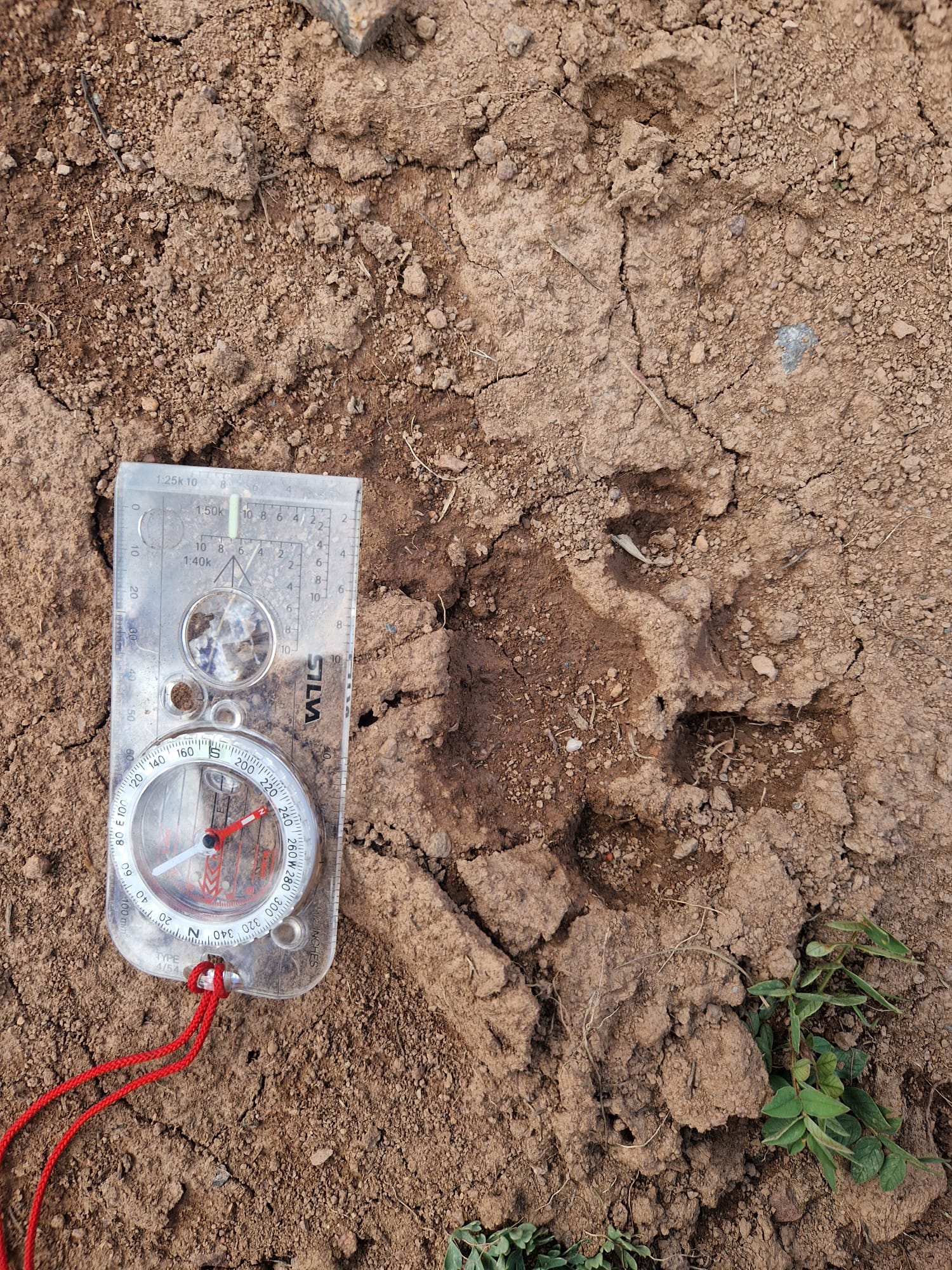 Samstags standen nur leichte Touren auf dem Plan, so hieร es. Diese Tour gingen wir mit Henry wieder auf der rechten Seite des Flusses. Leider startete die Tour mit einem starken Regenschauer und der Eingang des Tals wurde von einem Wasserfall versperrt, so dass wir am Hang entlang gehen mussten. Das war auf dem nassen Gras nicht einfach. Hinzu kamen noch unendlich viele alte Murmeltierbauten, die unter dem hohen Grass schlecht zu erkennen waren. Nachdem wir das Hindernis รผberwunden hatten, erreichten wir ein wunderschรถnes Tal, das von imposanten Felsen eingebettet war. Wir suchten mit unseren Fernglรคsern die Felsen ab und Spencer erblickte dann auch Steinbรถcke, die wir alle kurz beobachten konnten bis sie in den Felsen verschwanden. Wir gingen das Tal weiter hinauf und natรผrlich fanden wir auch wieder Steinbockschรคdel. Auf 3800m Hรถhe รถffnete sich das Tal in eine breite flache Flรคche, die von einem Bach durchquert wurde. Rechts und links stachen die Felsen hinaus. Wir waren uns einig, eine oder zwei Kameras in die Felsen zu installieren. Auf dem Weg zu den Felsen, fand ich dann Abdrรผcke einer Katze. Ich rief den Rest der Gruppe zurรผck. Wir verglichen diese Spur mit Spuren in unseren Unterlagen und waren uns einig, dass es die Abdrรผcke einer Pallas Katze, auch Manul, genannt sein mussten. Natรผrlich schauten wir uns weiter auf der Flรคche um und fanden viele weitere Spuren u.a. eine Wolfsfรคhrte sowie die Losung eines Wolfes. Wir installierten die Wildkameras noch und machten uns auf den Rรผckweg, auf dem wir noch eine Losung mit Knochen und Haaren fanden.