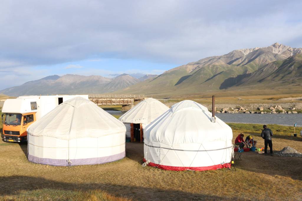 Am Nachmittag kamen wir im Camp an: Wunderschรถn gelegen auf ca. 3000 m Hรถhe, direkt am Fluss in der Nรคhe einer Brรผcke lag das Camp in einem wunderbaren breiten Tal. Die Landschaft war einfach herrlich. รberall im Tal waren Pferde und Rinder zu sehne, die sich frei bewegen konnten.