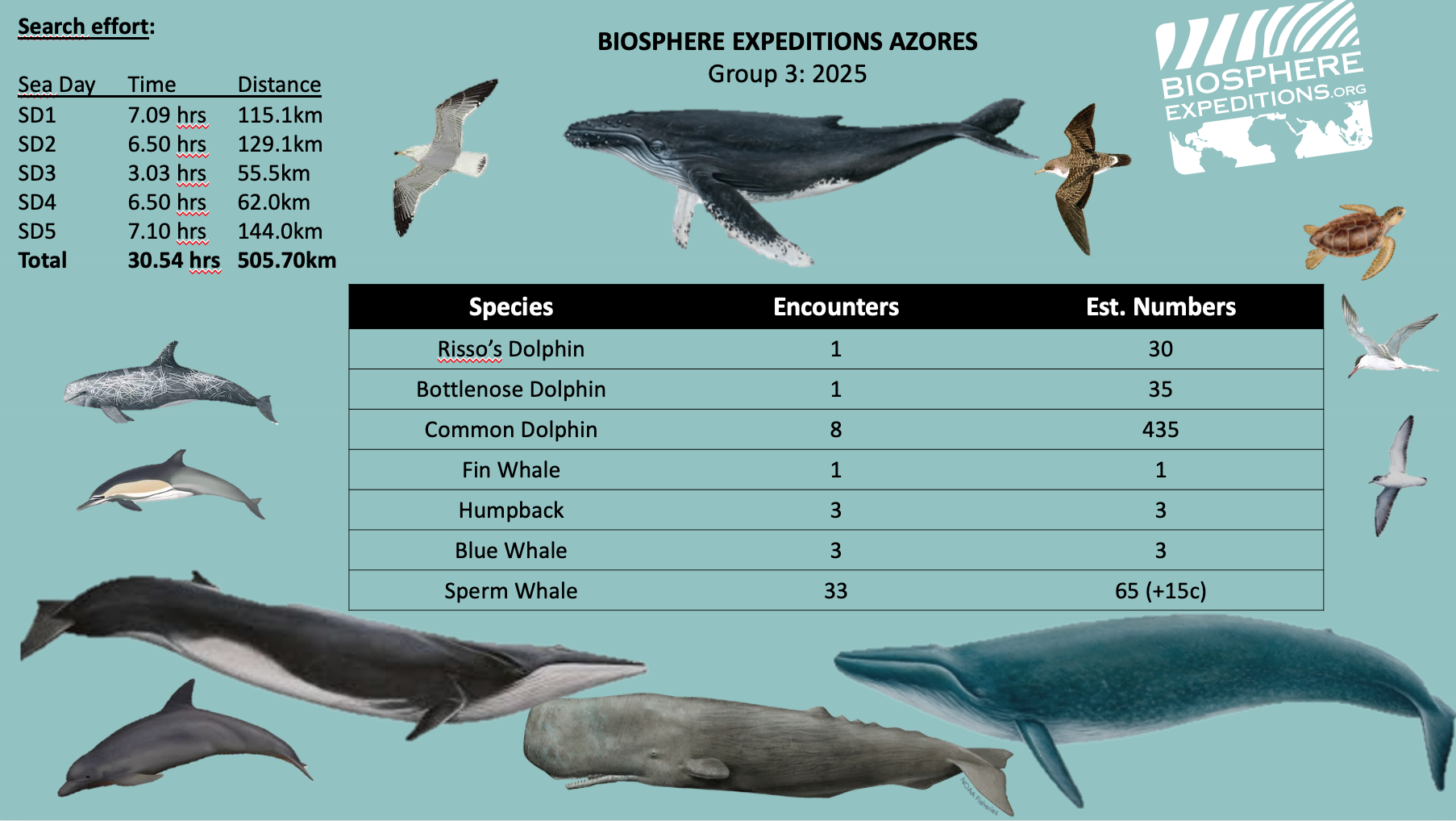 This yearโs project still has a lot of data to process, from over 125 cetacean encounters over 15 days at sea, sighting over 1500 individuals. But some species are absent from this yearโs research findings (e.g Sei whales) and dolphins have been found in lower numbers. On the upside, a few rarer records were noted such as orca, minke and Sowerbyโs beaked whale.