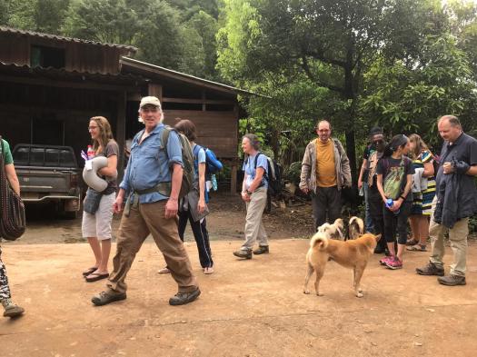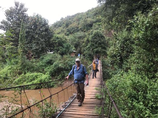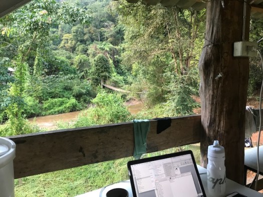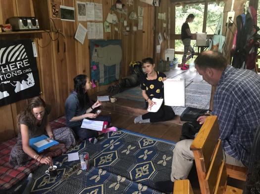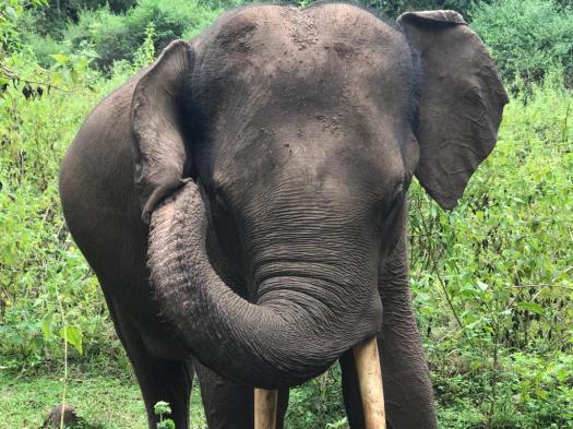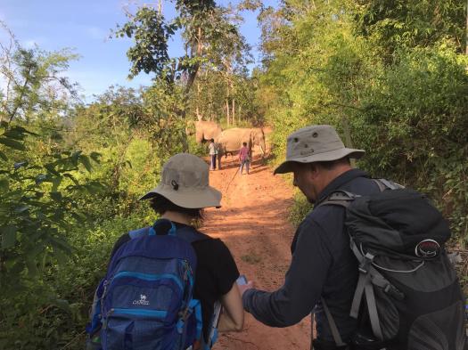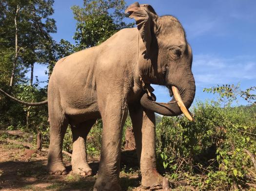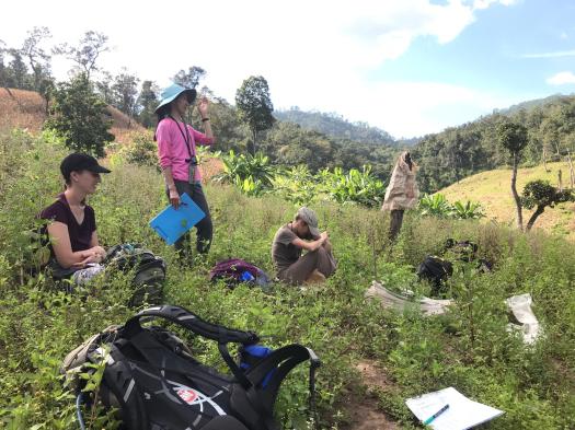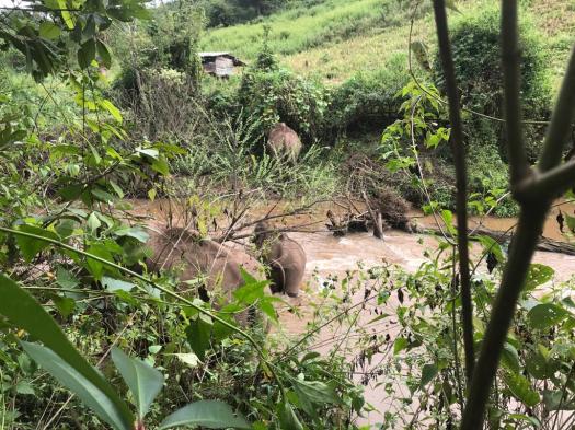 We left base at 08:00 on Wednesday for the 4.5 km hike to find the elephants. Too-Meh, the herd’s grandmother (57 years), her daughter Mae-Doom (23 years) and Gentong, Too-Meh’s grandson (6 years) were together near the river. They foraged most of the time and took a bath in the river later on. Right at lunchtime, one of the male elephants, Boon-Rott (13 years) joined them, so that almost the whole team was reunited for lunch. The third male elephant, Dodo (Gentong’s brother, 13 years) decided to roam around solitary. A team of two citizen scientists followed him up and down steep hills and even further away from where the rest of the herd enjoyed each other’s company. It was a very good first survey day – easy for some, more challenging for others, though.