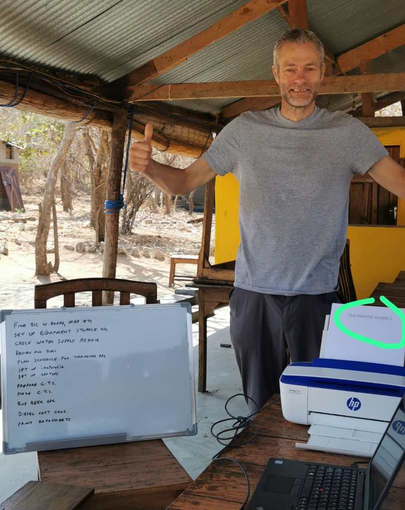 Sunday afternoon was peaceful at base camp in Vwaza. After a week of hard work and the usual endless practical challenges – water supply problems, missing kit, delayed delivery of new tents – we found that we were ready in good time. Even the unexpected news that our newly painted walls were not a sanctioned colour (sunny yellow: cheerful but apparently may be too bright for the wild animals) was resolved with minimum resentment or fuss by swiftly repainting in more wildlife-friendly British Racing Green.