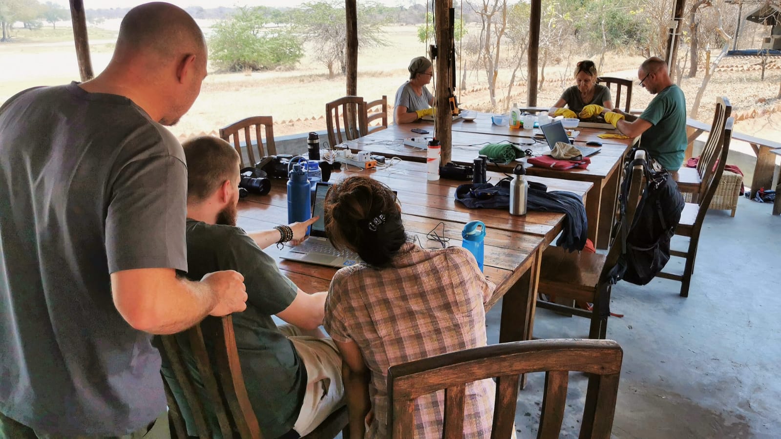 The team peacefully sitting in base camp checking camera trap images, studying ants under a microscope and sifting through fresh elephant dung were interrupted a moment ago by the VHF radio. LWT staff member Pili, leading the rest of the Biosphere team on a lakeside transect walk to count hippos, was calling for a rescue. The small group of our citizen scientists had been trapped by a herd of elephants on the floodplain. With good experience of elephant behaviour, Pili kept the team safe without problems, but they were blocked from walking back to camp by the elephants. At base camp, Benni and a couple of helpers jumped into a vehicle and set off to intercept and evacuate our trapped and intrepid citizen scientists. Not quite an everyday experience, but still, very much the kind of thing that can happen on an expedition that deserves its name.Â