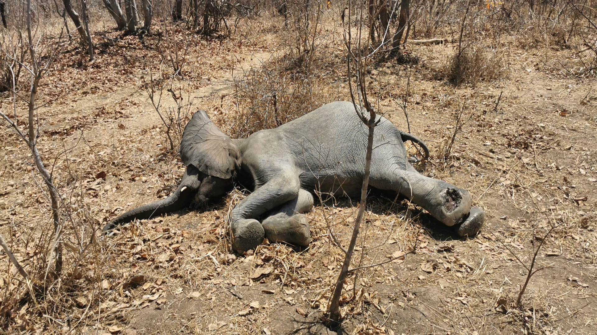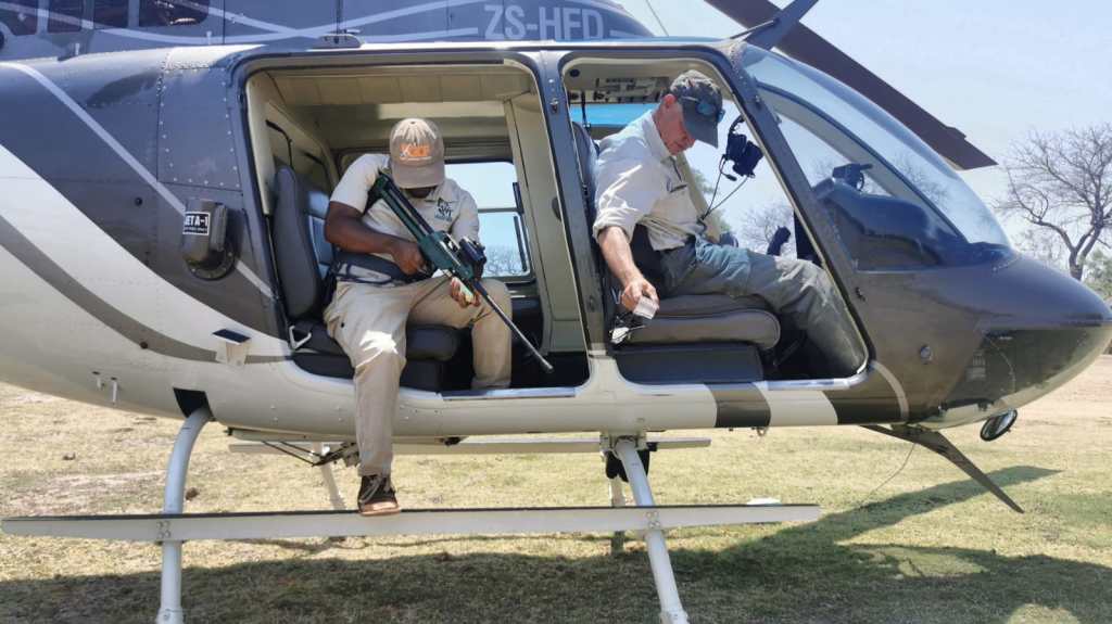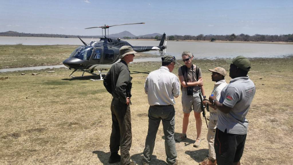 Our search continued at dawn the next day – with no more success – before the unexpected news that a helicopter was available locally and immediately for our use for this rescue mission. Things happened rapidly after that. The chopper pilot and the two vets flew on a search pattern, while the rest of us formed a ground crew in two 4x4s ready to help as needed. Within ten minutes, the helicopter team had located the injured elephant, separated it from its mother and successfully darted it. By the time we arrived on scene, the anaesthetised animal had been stabilised and checked by the vets. The young elephant had such a bad wound on one foot – and septicaemia caused by the injury – that the vets made the decision to euthanise it, to avoid a slow and inevitable death.