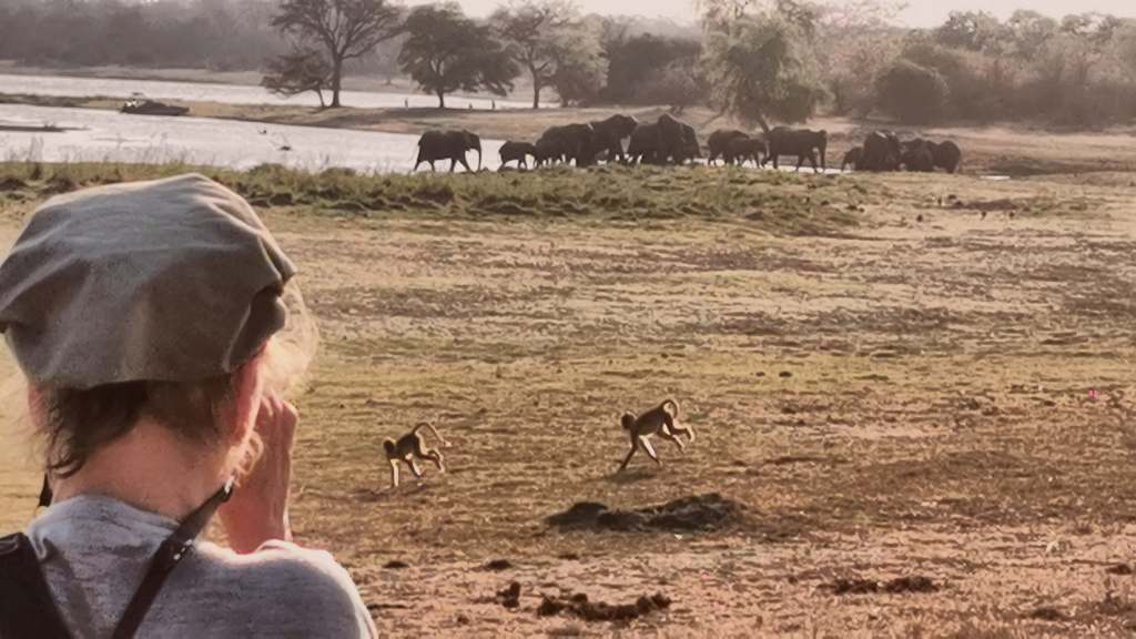 And in between all these research tasks, we have been enjoying spotting – or being bothered by – the local wildlife. Elephants and hippos are seen daily, with an almost regular visit by elephants herds walking across the river in front of base camp every afternoon. We have also had elephants calmly wandering through base camp at night, tearing at branches for food and not threatening us at all, so long as we just watch and enjoy. There are clearly many wild animals exploring around our camp every night, judging by the grunts, snuffles and shrieks heard in the small hours. Surely not all of these sounds come from the expedition team’s tents. Last night we heard hyaenas calling to each other. Our night drives and camera traps have also revealed a diversity of nocturnal animals – bush babies, genets, civets, owls and porcupines and more. Baboons are a constant, but fascinating nuisance at base camp and have to be chased away from our buffet breakfasts.