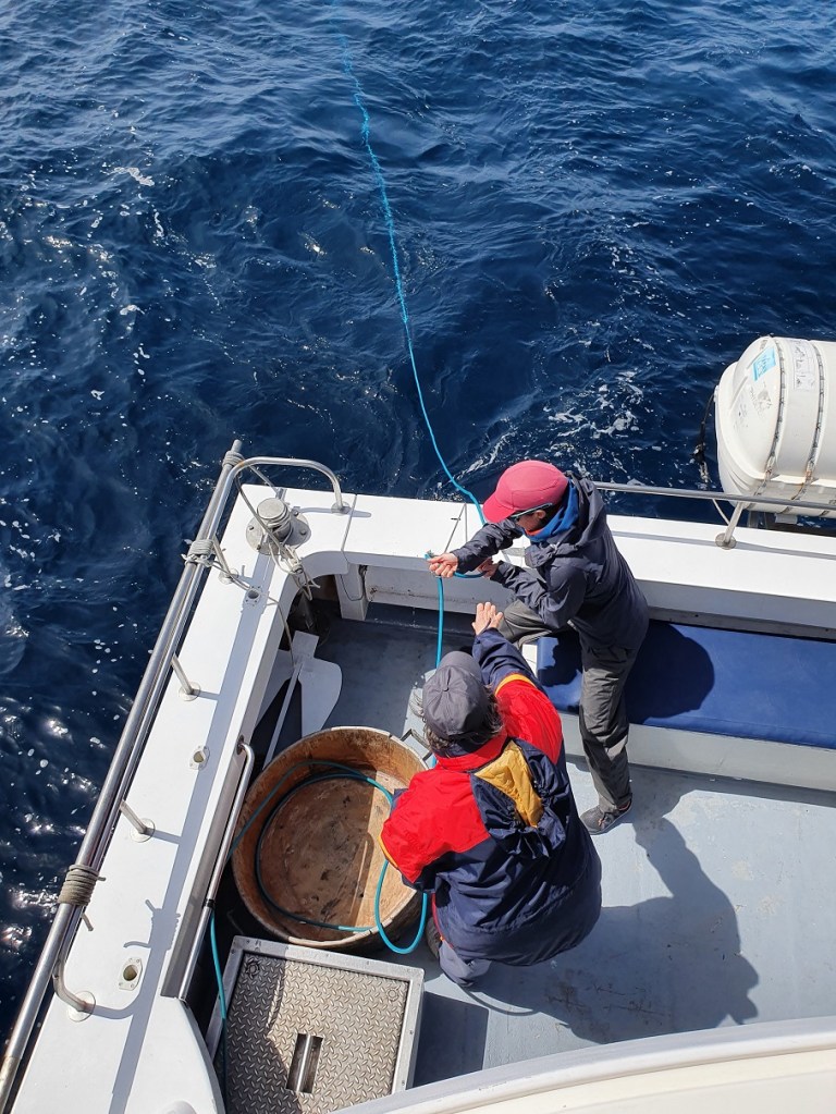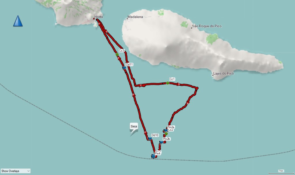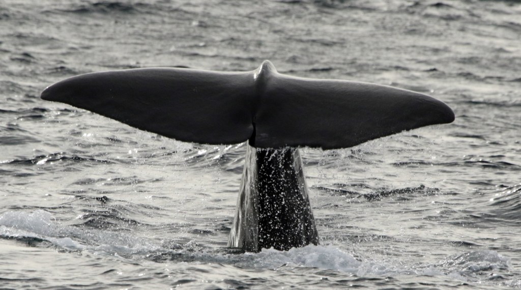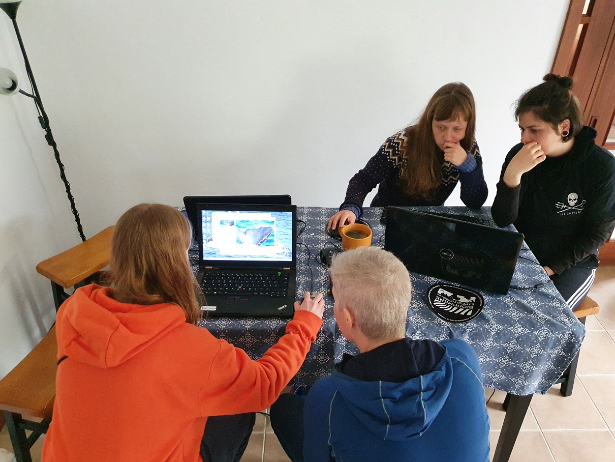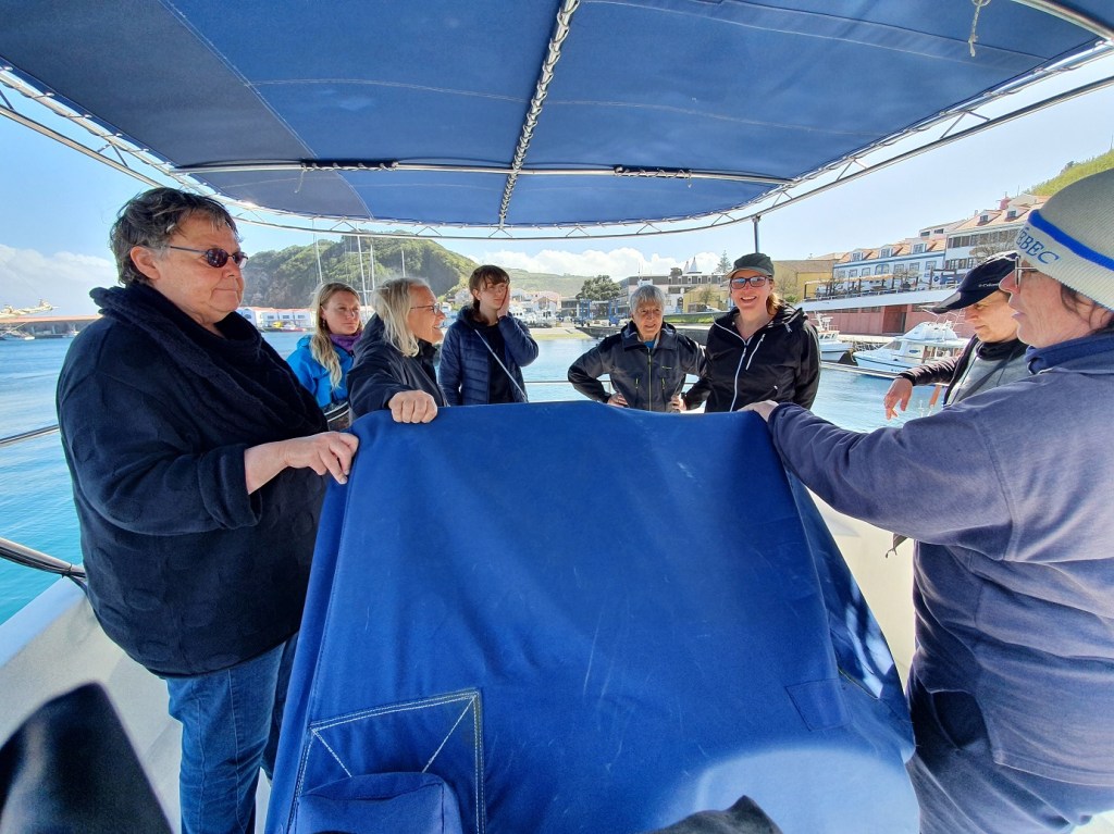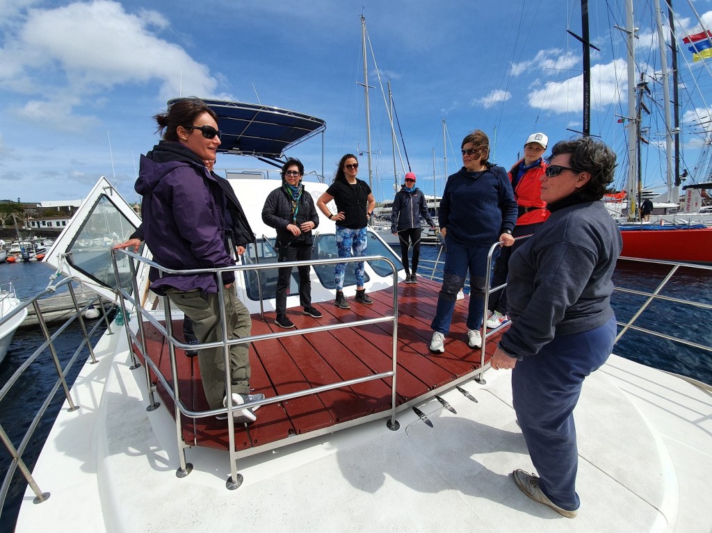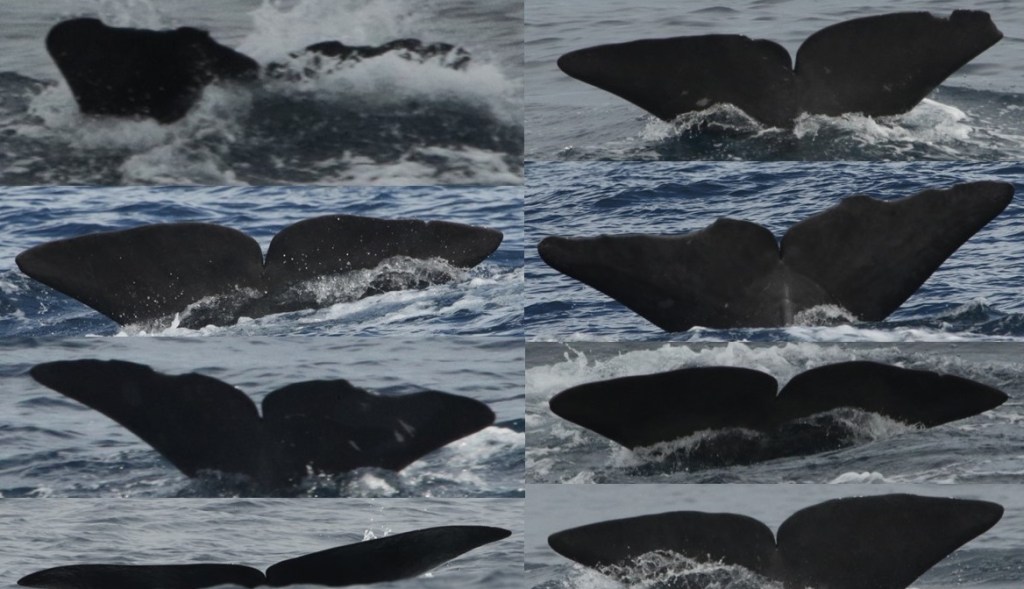 All of Saturday morning was dedicated to sperm whales. Multiple individuals were spotted in an area north of Faial. There was even a group of four of them socialising at the surface, most likely two mothers with their calves. As the mothers dived to feed at depth, the calves stayed behind at the surface. Our whale volunteers managed to collect a total of eight different flukes on camera during 14 separate sightings. We got one twice, others did not dive, hence no fluke, or some fluked before we got close enough to take a photoID shot, or the fluke disappeared behind a large wave. Being out there does show the patience and dedication cetacean scientists such as Lisa must have to collect data ‘one fluke at a time’. It was a great morning giving insight into this iconic cetacean species, once the main target of whaling here, while currently being one of the most appreciated during whale watching.