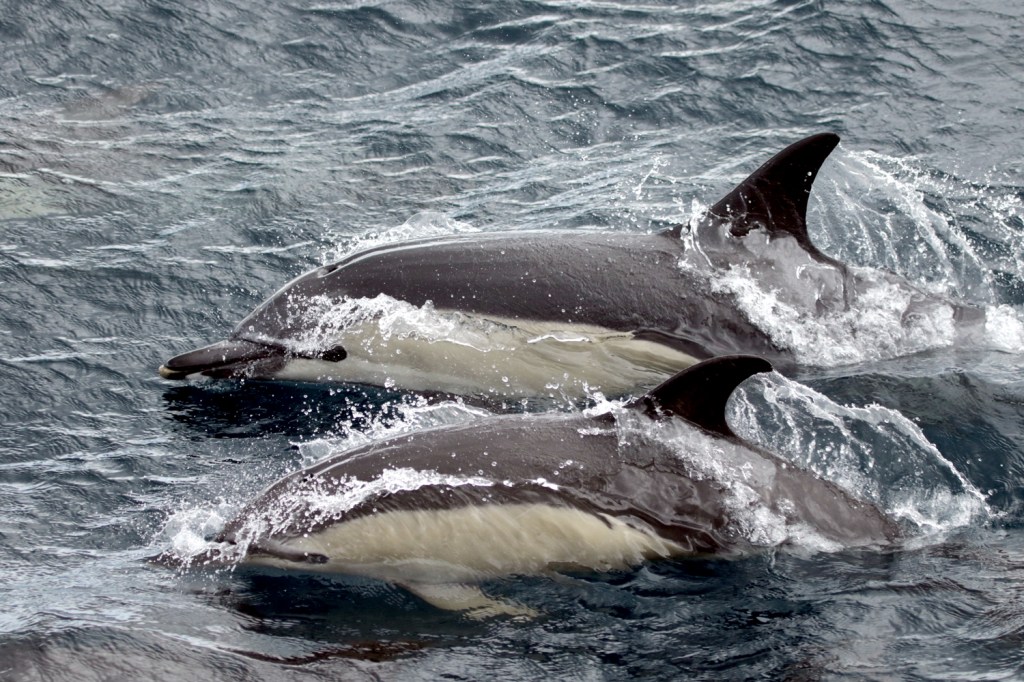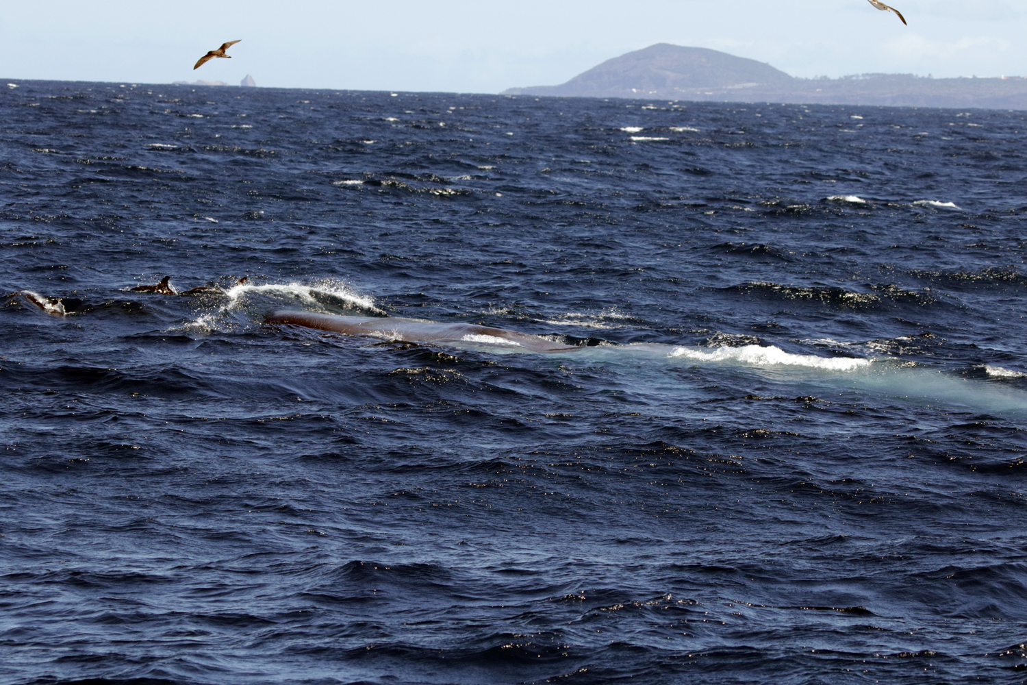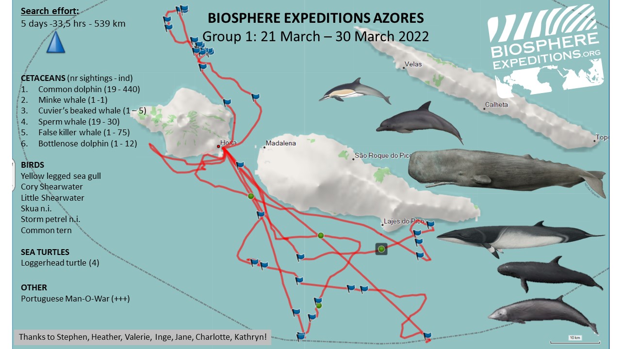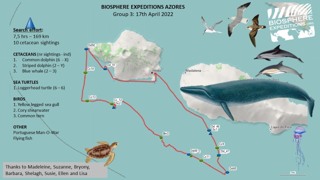 On Easter Sunday we left the harbour, with a spectacular view of the cloud-free Pico volcano and could even see some snow on the top. The sea looked promising. Our first sighting was a large mixed group of common and striped dolphins. The first striped dolphins of the season for Biosphere Expeditions and our cetacean species number 10! They jumped synchronously off in the distance but were not interested in bowriding. A loggerhead turtle passed near the boat, and we saw another five ones later that day, with many Portuguese man-o-war around, one of their favourite snacks. Further ahead of us, we saw a huge blow…10 m high…must be a blue whale. And sure enough after the blow, we saw the gentle giant. It is amazing to watch its head come out, then the back and more of it and then there is even more of it still…..until you see what appears to be a tiny dorsal fin while it slides back into the water. Common dolphins were excited too and chose to bowride…you guessed it..the blue whale, what a sight !! After getting photoID shots, we saw another blow ahead of us and decided to check this one out also. It appeared to be another two blue whales. One smaller – probably a juvenile. Given their enormous sizes, it becomes a bit confusing what is a calf, a juvenile or an adult…. We enjoyed following them for a while until we got the photoID shots and then headed to Capelinhos, straight into strong winds before heading back to Horta and enjoying the view of the cliffs from the sea.