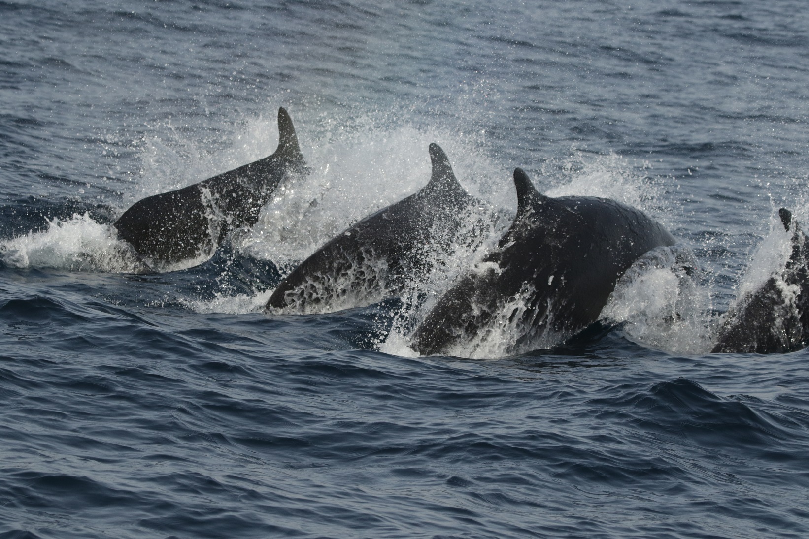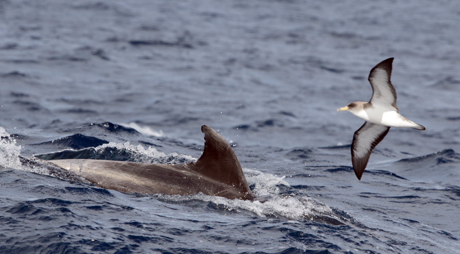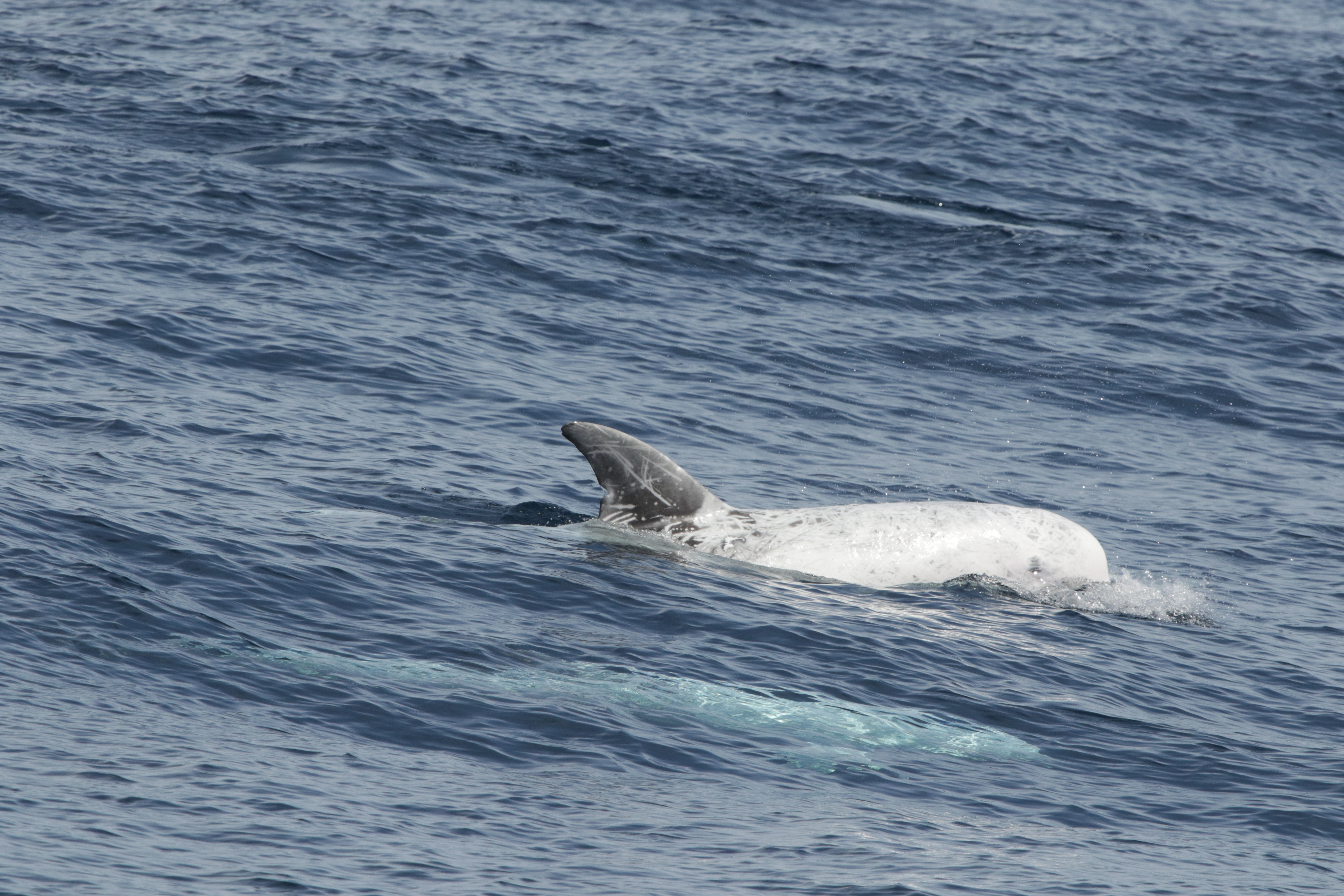 The vigias contacted our captain Siso on the radio with a special sighting, so we headed to the spot they indicated. The sea surface was rather flat, when our dolphin volunteers spotted some dolphin dorsal fins. Then we saw some white ones and others much darker. Coming closer, it became clear that these were Risso’s dolphins. Some call them the ghosts of the sea and they indeed have something magic and mysterious about them. They are easy to follow under water, especially the white ones. Risso’s are dark in colour when born but as they grow, through interaction and aggression with their peers, they get scars on their body. The pigment does not get replaced and thus you get older individuals that are almost fully white…. A truly unique encounter.