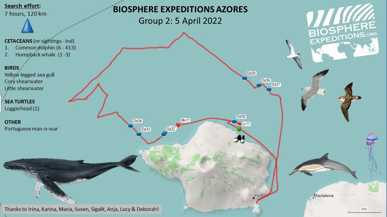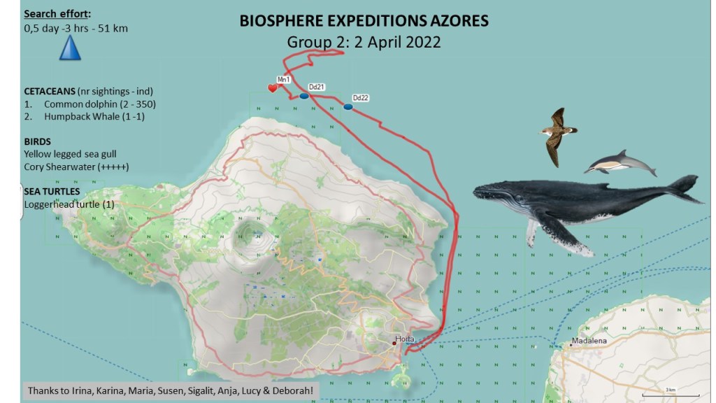 It has to be said, the teamwork on board was amazing, Barbara and Suzie ensured the datasheets were filled in despite all the commotion going on. Madeleine and Suzanne took excellent photos and the front deck whale volunteers Shelagh, Ellen and Bryony showed great determination and stayed out on deck through wind, sea spray and lots of waves. Lisa made sure to record all these incredible sightings on the Monicet App of the University of Azores for their cetacean monitoring programme. This will be an Easter weekend none of us will forget.