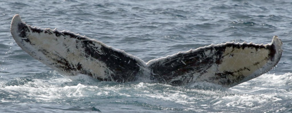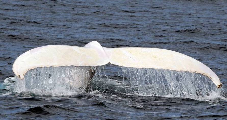 Later in the afternoon our cetacean citizen scientists heard a lot of excitement on the radio channel. ‘A baleen whale….there are two …..marvelous…..one white, …..’ Not sure what to expect exactly, we travelled southwards and off Ribeirinha when all of a sudden a massive humpback whale comes up starboard side of our catamaran. Almost immediately after we see a fully white smaller humpback whale come up along side it. We were speechless, as the odds of seeing an albino whale are almost zero. We followed them and were treated to both of them fluking, only to discover that our white friend does have some black spots on the ventral side of its fluke. So not an albino, but a 95% leucistic individual. Migaloo is a well-known male albino humpback whale from Australia – could “our” whale perhaps be the first one in the Northern Atlantic? Although the time to return to the harbour had already passed, we could not resist and decided to follow the duo a bit longer as this clearly was a once-in-a-lifetime opportunity. Smiles all around as we returned to harbour eventually. During our debriefing Lisa matched the fluke of our white friend on the HappyWhale programme online to a white humpback seen around the Spitsbergen/Svalbard feeding grounds in 2012 (see video below). After more research by Lisa, the same individual appears to have been seen in the Guadeloupe breeding area in 2015, 2019, 2020, where it was given the beautiful name Willow. These life stories make extraordinary sightings even more interesting, unravelling where this individual has been.