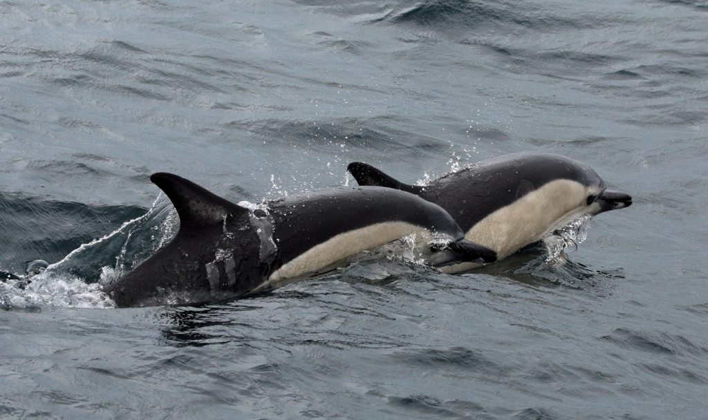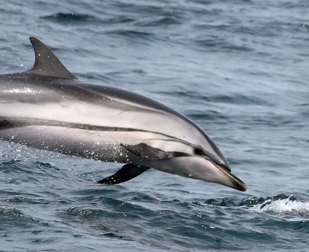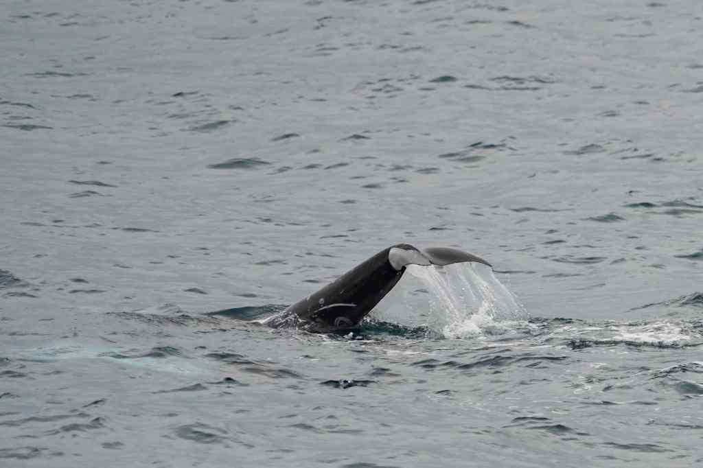 Common dolphins approached our boat to bowride and followed the catamaran for quite a while, until we spotted a group of Rissoโs dolphins, much to the teamโs delight. Their distinctive scars make them a good species for photo-ID. We soon realised we were actually observing a mixed group of Rissoโs dolphins and common dolphins. Lisa commented that both species are not often seen together due to their different feeding habits, making it a special sighting. Rissoโs feed at depth on cephalopods, whereas common dolphins feed mainly on small fish closer to the surface. We even spotted one lucky Rissoโs dolphin that escaped a shark attack, with clear markings on the tail.