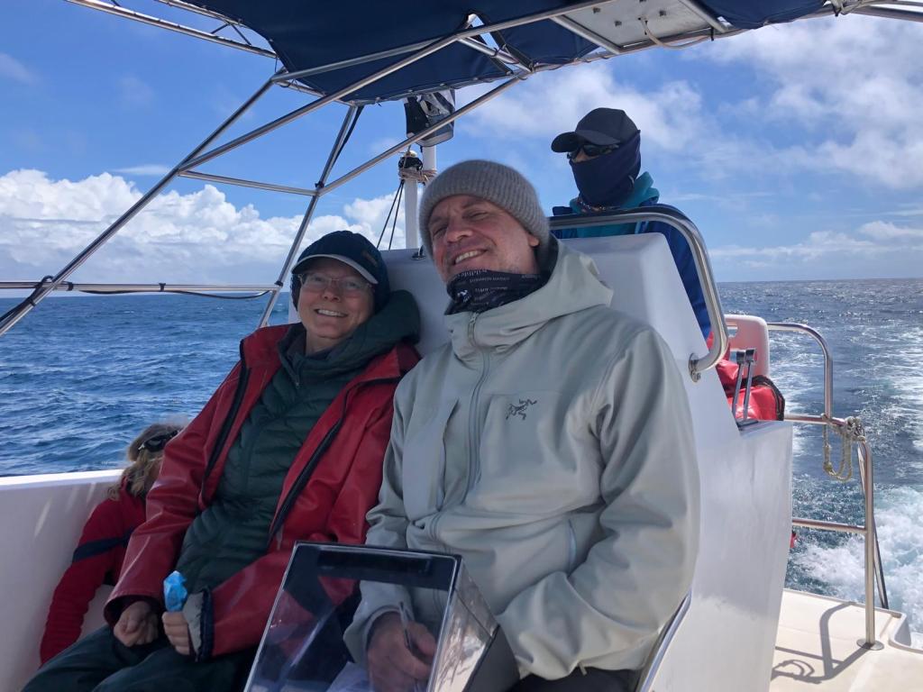 Monday was rainy and windy, but finally with calmer seas, so our skipper Norberto treated us to an extra long day. We added Rissoโs dolphins as a new species for this second group and saw more than 12 sperm whales, initially spread out widely, but slowly coming together at the surface. We also spotted a suckling calf, multiple females and several juveniles. We photographed two flukes, which Lisa matched to numbers โ6249โ and โ 6253โ in the sperm whale database. These animals were last seen here in July 2018. It was a rare treat and a unique goodbye to our second group of expeditioners.