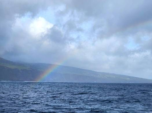 Against all odds, our observers managed to spot a group of common dolphins in the high waves. Later, we came across a pod of 40 bottlenose dolphins joined by 20 common dolphins surfing the waves, bowriding and clearly more at ease with the rough sea conditions than us. We observed several calves of both species, another highlight, and managed to get good photo-ID shots. It was an adventurous morning and we thank our skilled skipper Norberto for sailing us back safely to the harbour. A rainbow over the sea surface was an extra bonus, as well as a nice โafter-seaโ drink at the legendary sailorโs โPeter Cafรฉ Sportโ.