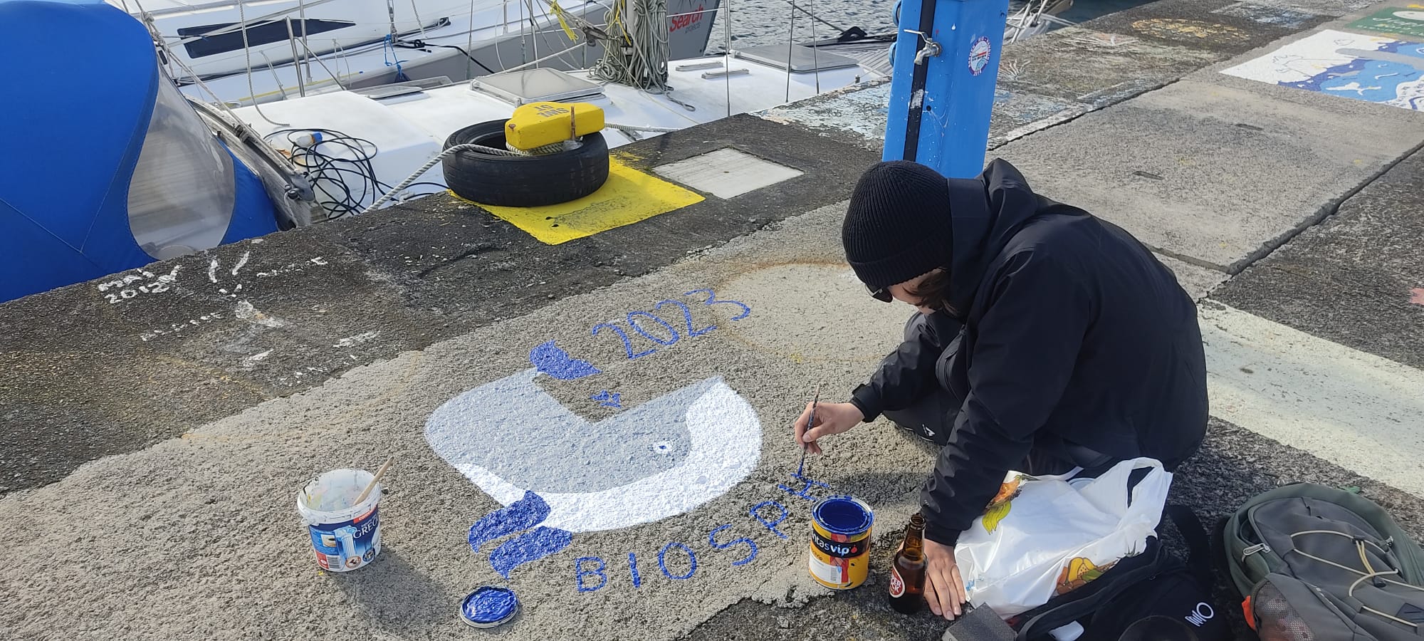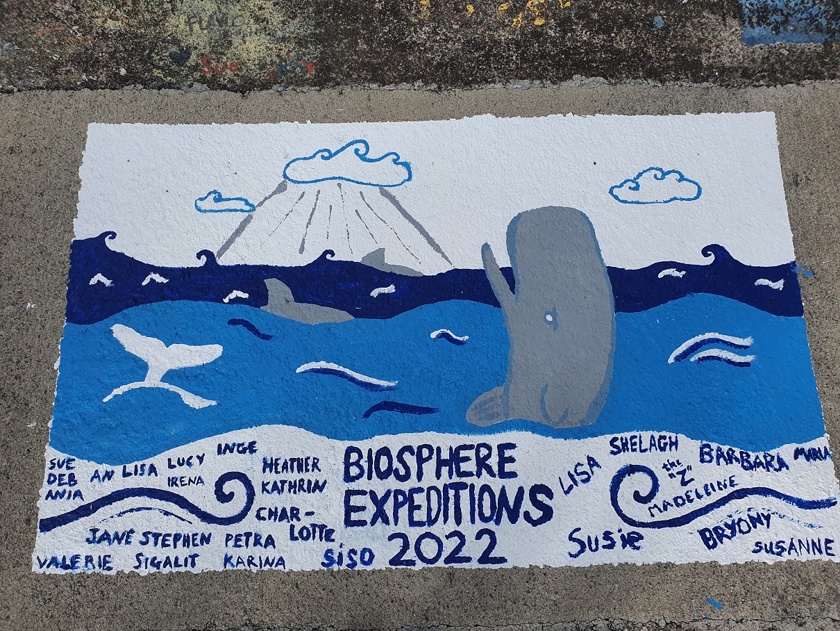 To conclude this last group, let me tall you about a nice tradition in Horta: the paintings in the harbour. These are mostly done by sailors passing through on a trans-Atlantic trip or a tour around the world. It is supposed to bring good luck out at sea. These paintings turn the harbour in a colourful outdoor graffiti exhibition space, telling the many stories of those who passed by here. Of course we join in every year, this time with a design reflecting the cetacean sightings we had. Kathryn from group 1, who is an illustrator, came up with the design and outline of the drawing, Lucy from Group 2 added the names, while Group 3 added our leucistic humpback, more names and a final finishing touch of the waves. Of course I am biased, but I do think that our drawing does stand out in the harbour and deserves its place next to the ones from previous expeditions….. Safe journey back home to all our whale and dolphin volunteers and thanks for making this season a good success ! For an overview of what we achieved, stay tuned for our final blog.