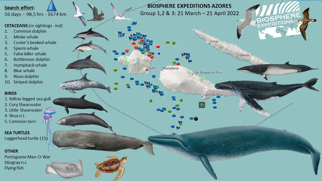 During this 16th expedition, citizen scientist participants spent 16 days out at sea, adding up to 100 sea-hours while covering 1674 km around the islands of Faial, Pico and Sao George in the central group of the Azores. The expedition’s search effort resulted in 127 sightings of 10 different cetacean species. In terms of abundance, the common dolphins come in first, while the iconic sperm whale was sighted on 59 occasions. Baleen whales are known to migrate through Azorean waters in spring, hence the timing of the expedition. The expedition recorded six humpback whales during three different encounters, one minke whale just outside Horta harbour and three majestic blue whales. As for dolphins, most of which are resident, the well-known bottlenose dolphins were spotted five times, Risso’s dolphins on four occasions and and striped dolphins twice. Of the larger toothed whales, the expedition witnessed a feasting bonanza of 75 false killer whales on tuna and even caught a glimpse of five elusive beaked whales.