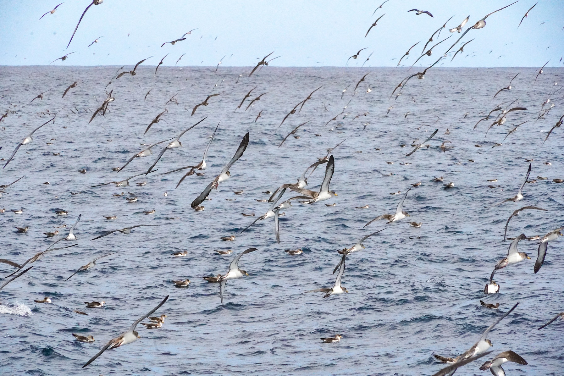 For Group 1 it was very impressive to come across a group of 75 false killer whales feeding on tuna with seabirds all around. Group 2’s most exciting moment was spotting our first blue whale in sea state 6 ‘all hands on deck’ and Group 3 definitely wins the prize of the rarest sighting ever, seeing a leucistic white humpback whale.