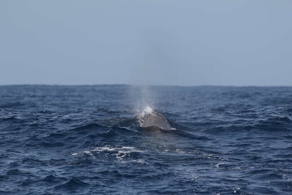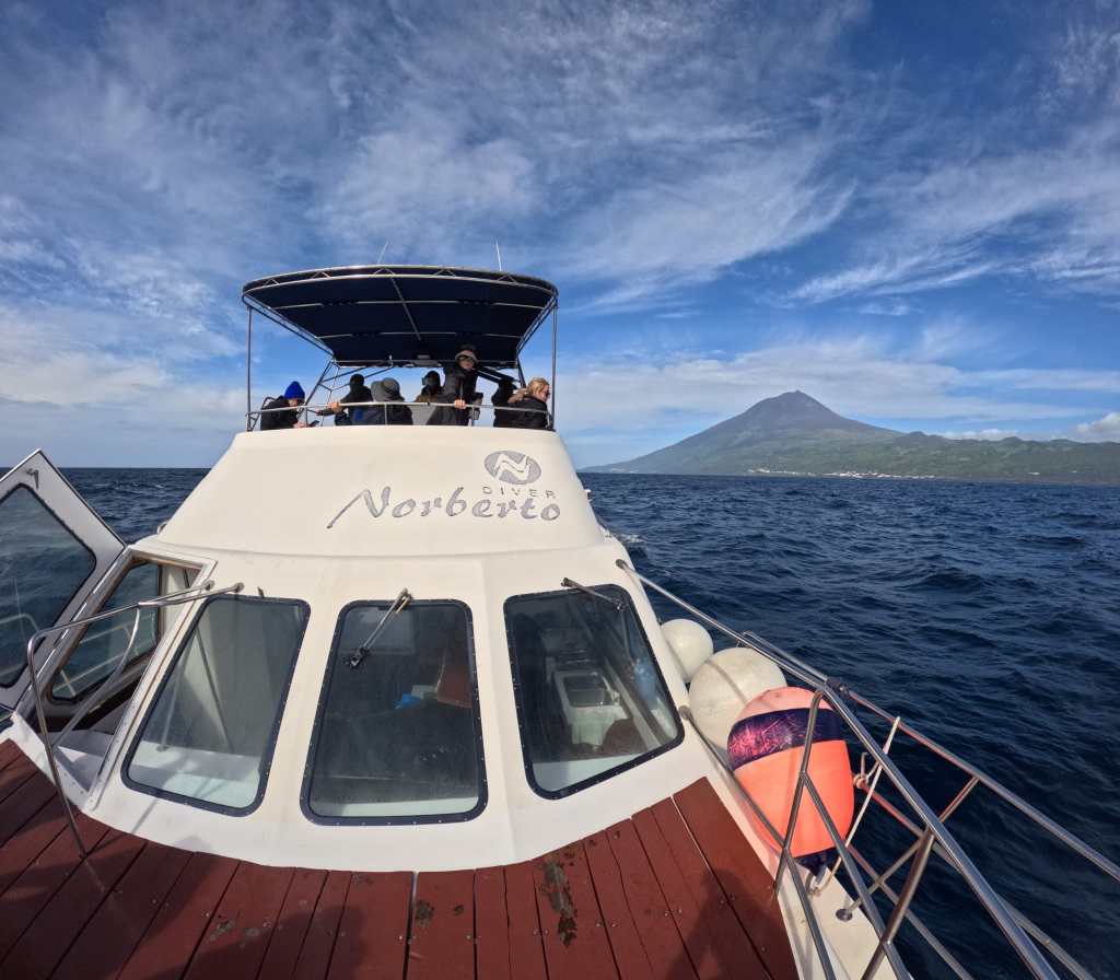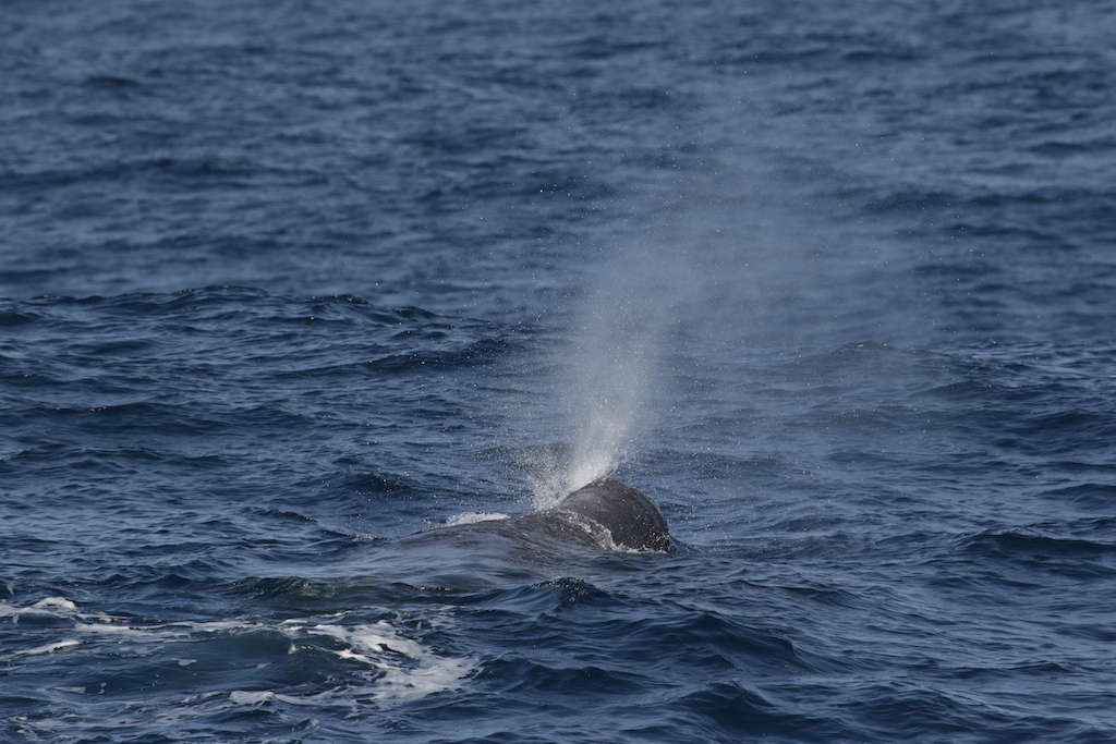 Sea day 3 began with clear skies and views of Portugal’s highest mountain on the Island of Pico. We headed for the lee of the island to increase our chances of sighting (and recording) target species. Despite the best efforts of the spotters and deployment of the hydrophone, we were not seeing (or hearing) anything. Eventually we received information that a humpback had been spotted off the north coast, so we headed into the somewhat rougher waters on the windward side of the island. This culminated in a 145 kilometre circumnavigation of Pico during which we did manage to find a juvenile humpback feeding and were even treated to a couple of breaches.