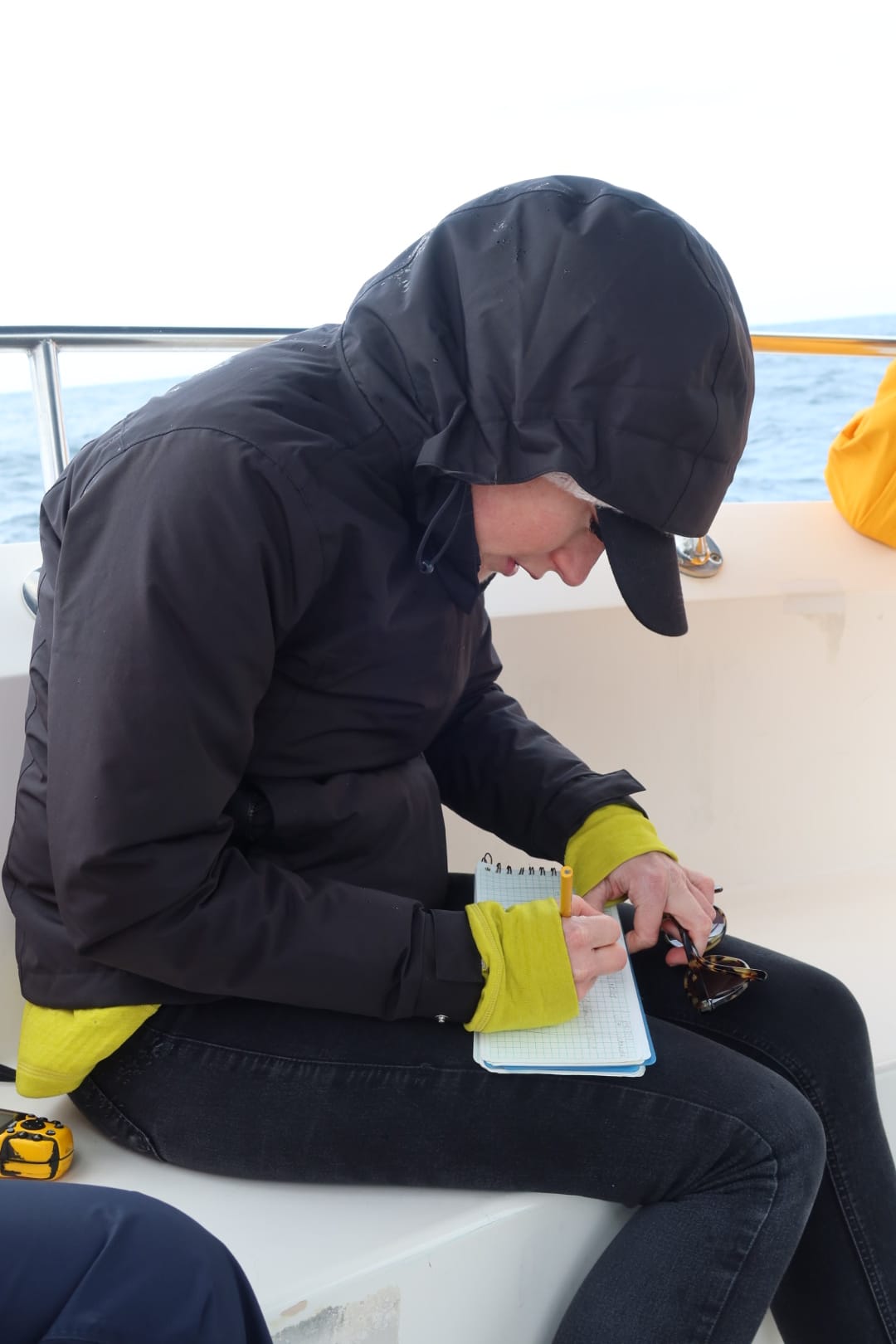 With the weather changing and winds building on Thursday, we pursued a suspected sighting of more than one blue whale, several miles north of Faial. This turned out to be a fairly challenging day, with the boat making way into oncoming weather and waves, peaking at force 5 – which makes staying upright a challenge – let alone doing any data collection. However, persistence often pays off, and we were rewarded with sightings of three blue whales. A great job by all to get the data recorded and stay on the boat….