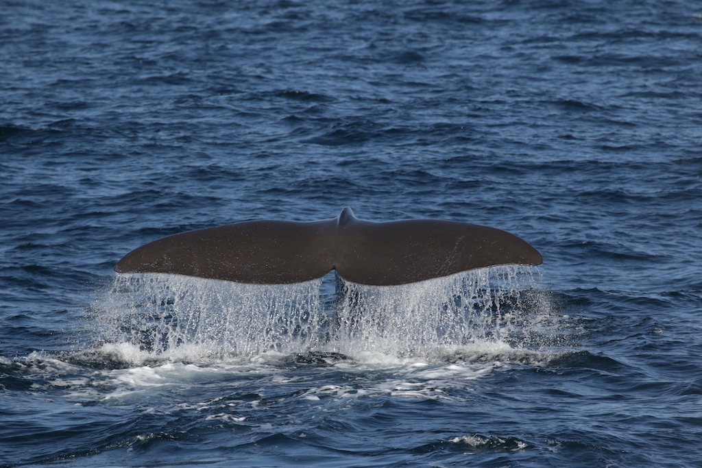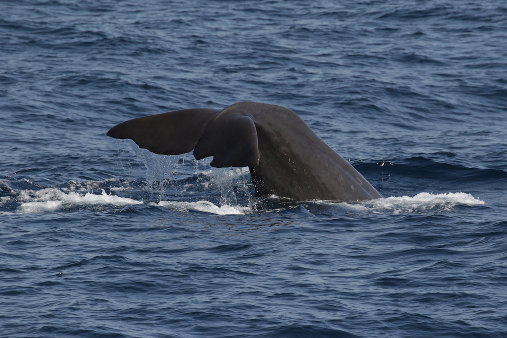 But Biosphere Expeditions obviously goes beyond listing species and counting numbers. The main purpose of our expedition is to understand population dynamics, local movements, seasonal migration patterns, as well as group composition and reproduction. Out of the total of 59 sperm whale sightings, we managed to identify 44 individuals of which 18 (40%) are known individuals and 26 (60%) are new individuals of which fluke shots were added to the catalogue. We actually repeated one individual within the expedition, sighted both on 28 March as well as 19 April. Within the known individuals, there are three well-known groups: the one of nr 19 first seen in 1987, the group of 1598 and the group of 2808-2448-3483-6089 with calves of last year. We also spotted a few male sperm whales, one of which is known as Tiktok, that seem to be more resident around the Azores archipelago, often sighted close to São Miguel. This is rather unusual, as most males migrate to the Northern Atlantic for food, while the females are known to stick around.