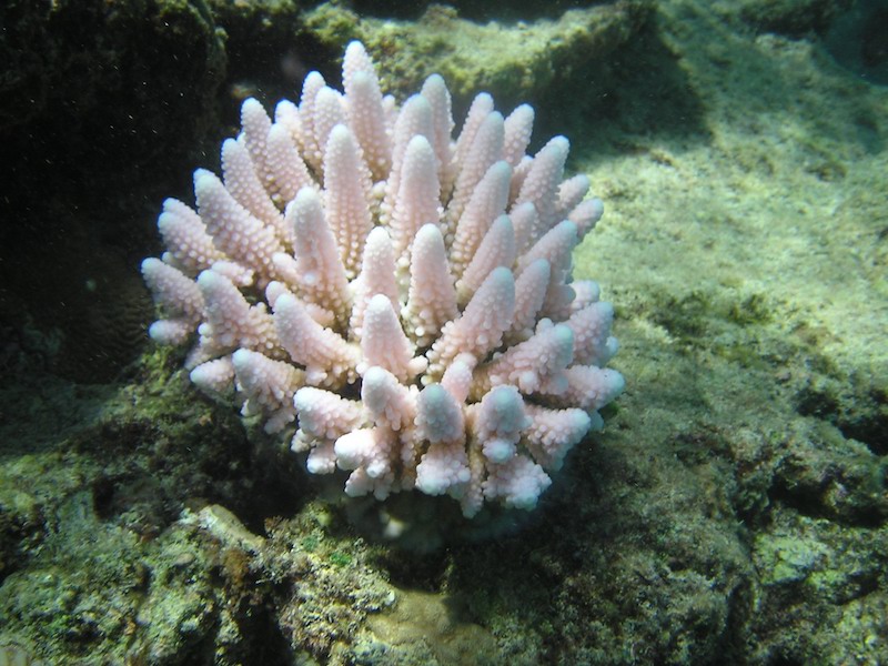Acropora coral (previously dominant in Maldives reefs over geological time in shallow water environments) recolonise and dominate the shallowest reefs (to 5 m max), where bleaching had damaged them and where grazing is extensive (example site: Kuda falhu). We think (re)growth of any coral below 5 m is difficult in many central atoll reefs, because of extensive rubble fields of unconsolidated material drifting down the slope from previous bleaching, then storm events.