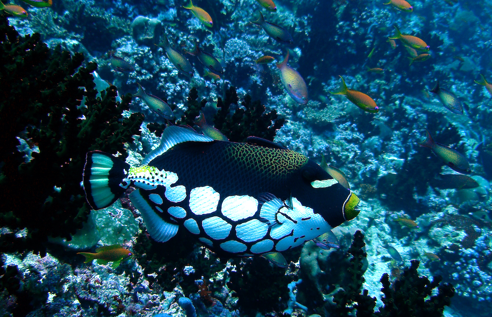 Today started with an early morning lazy dive at a well-known dive spot at Rasdhoo atoll. We saw lots of our indicator fish (grouper, snapper, butterflyfish, sweetlips, parrotfish, etc.), a graceful small school of eagle ray and a handful of sharks cruising a steep reef drop-off going deep down into the blue where us mere mortals with our heavy, noisy and clunky gear to survive in the water cannot go. Jacks cruised the blue too, slow and lazily, like a sheathed arrow, ready to dart at a moment’s notice when prey is near. Above us, unicornfishes amused themselves in our bubbles, below longnose butterflyfish picked away at corals in the reef garden. Resplendent anthias floated between the corals and did their name proud. Parrotfish munched and grated against the corals, their excrement the creator of those white sandy beaches that we associate with the dreamland we call the Maldives. A goatfish barbled its way along the sandy bottom in search of food. A Napoleon wrasse floated by in between us, curious as they are, but, alas, quite small (about our size) as their docile and inquisitive nature is their undoing in the face of the destroyer.