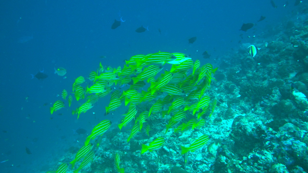 And because we destroy, our job is to research and protect where we can. What was it like 50 years ago, when the Maldives where in a pre-tourism slumber? How many hundreds of snapper would we have seen today, how how many sharks would have policed the blue, how big would that school of eagle rays have been? A whole university perhaps? It’s hard to know and hidden by shifting baselines. We know we are part of the problem and this is why collecting reliable data over many years, in our case over a decade now, is so important. But are we just documenting the inevitable decline? It’s hard to know. The first few days tell us that at least it does not seem to have become worse. But that is only a snapshot impression, an educated guess based on a few observations. That’s another reason why recording things in details is so important and why lazy dives such as this one are rare. Why waste your time being tourists when you can be citizen scientists instead?