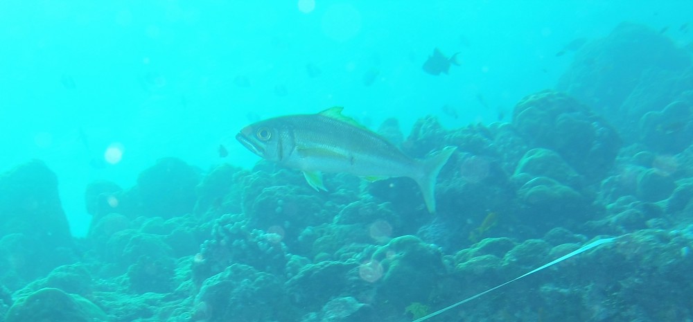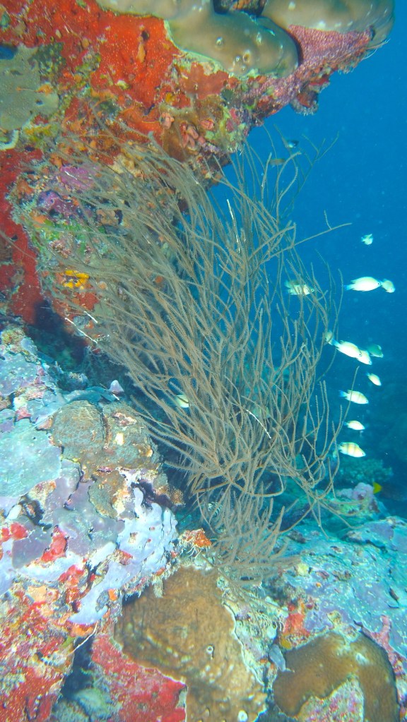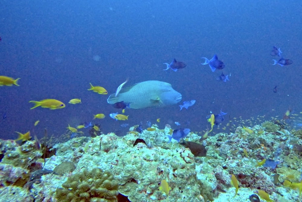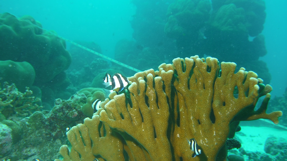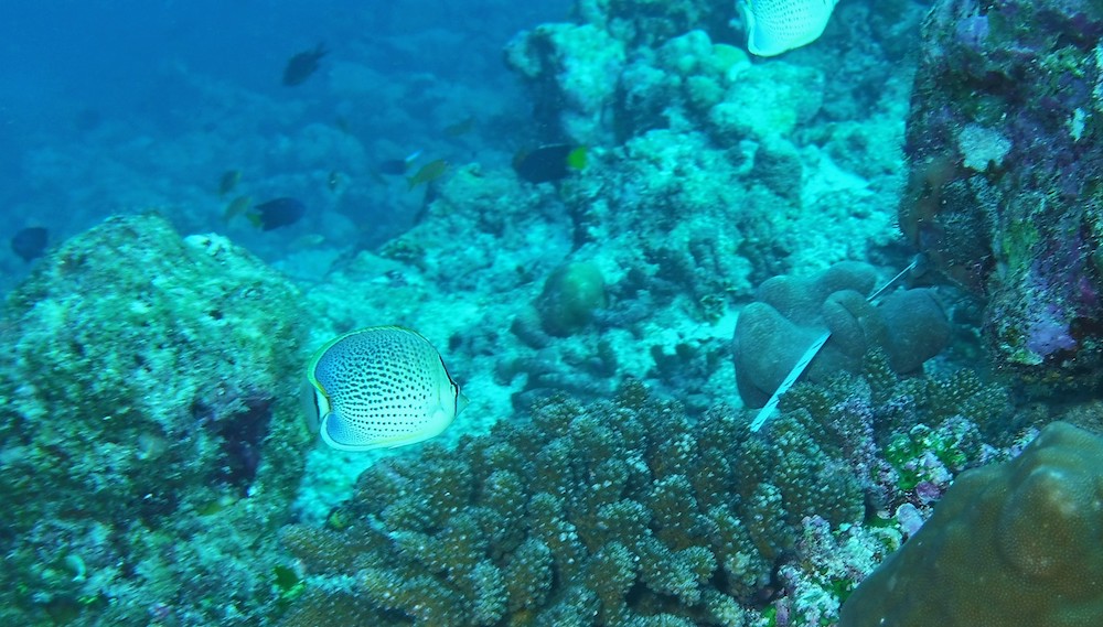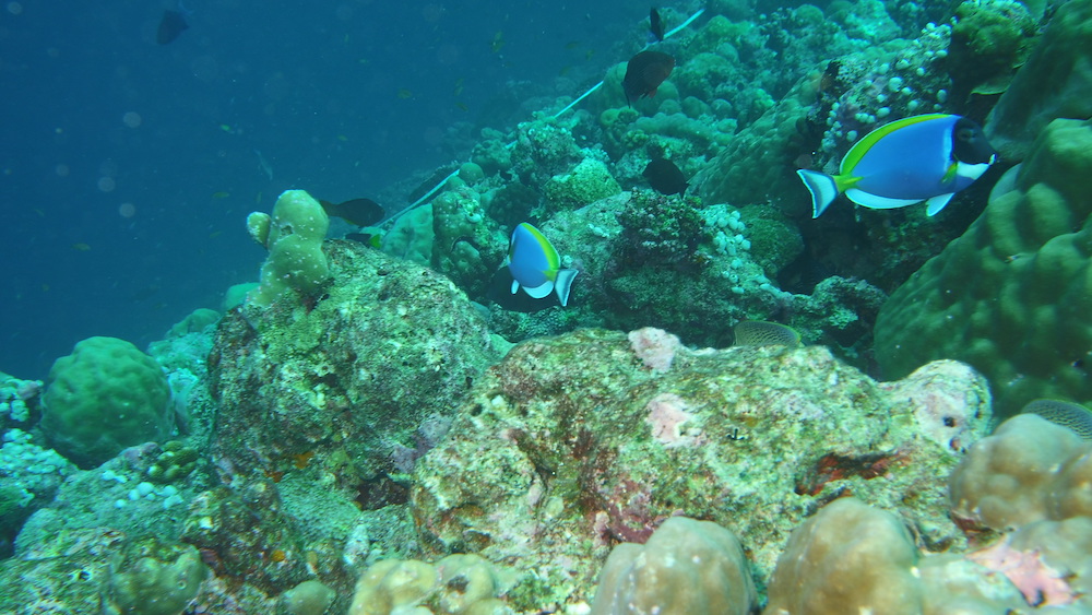 Today is our first day of surveys only. Like a fairly well-oiled machine we descend onto the reef, lay the line of science, then count fish, invertebrates and impacts as well as substrate along it. The numbers and codes we glean from two depths tell us tales of reefs hanging on, despite multiple stresses: oceans that are getting warmer and more acidic due to climate change, land reclaims through artificial sandbanks whose grains in the current smother the corals, building works on many islands and increased tourist activity as if continued growth on a finite planet and building bridges between islands was the answer. It is not. The former is a mathematical impossibility and the latter a short-sighted pipe dream.