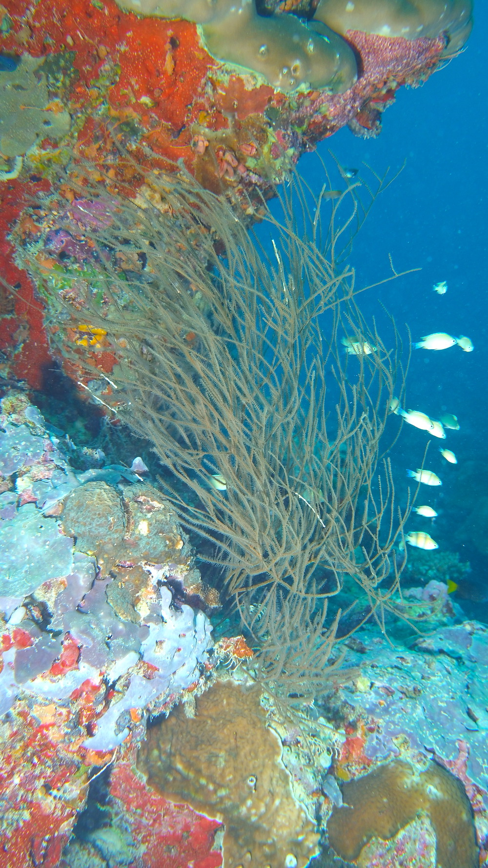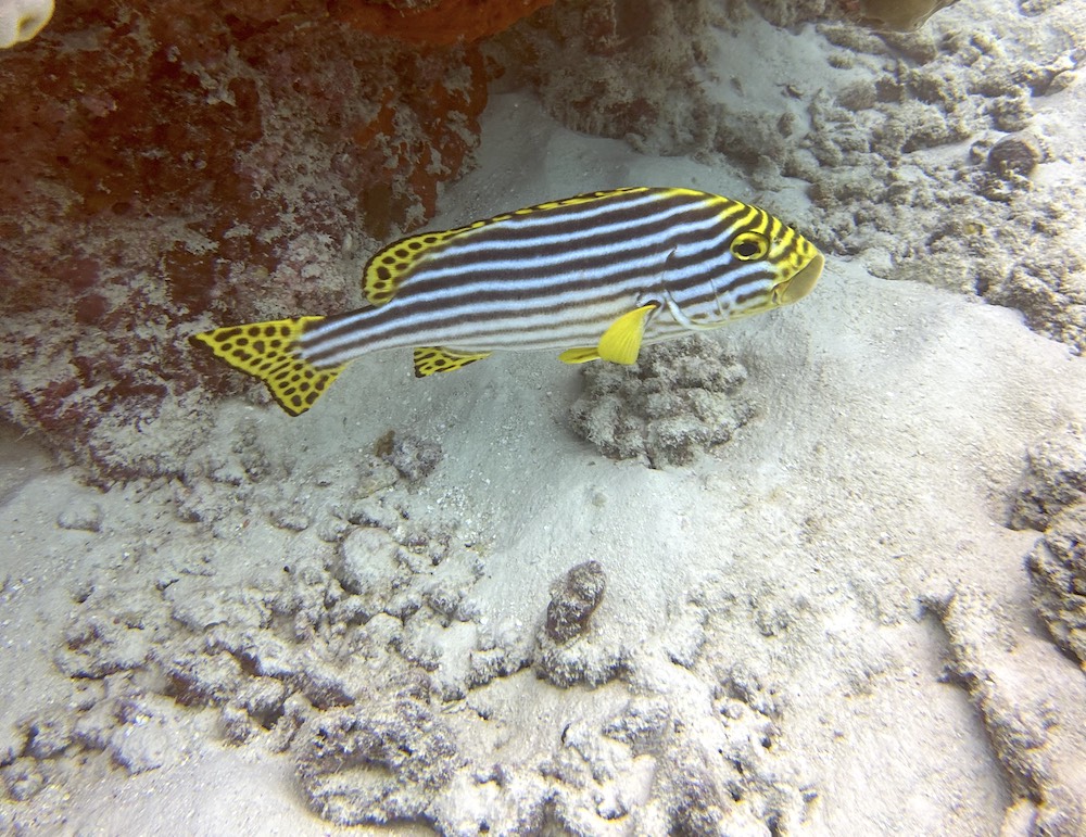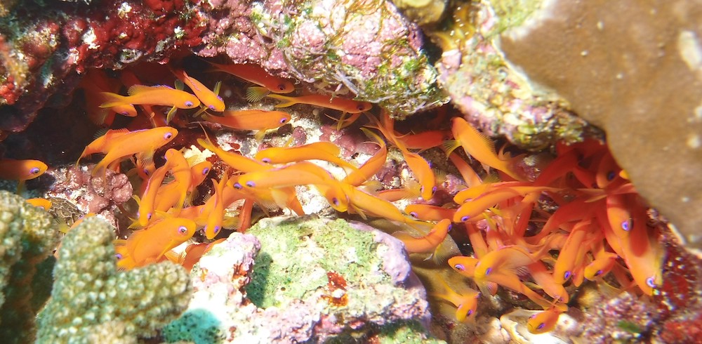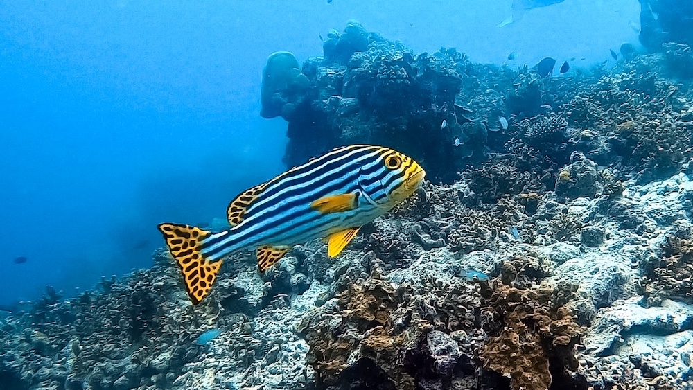 Today is our first day of surveys only. Like a fairly well-oiled machine we descend onto the reef, lay the line of science, then count fish, invertebrates and impacts as well as substrate along it. The numbers and codes we glean from two depths tell us tales of reefs hanging on, despite multiple stresses: oceans that are getting warmer and more acidic due to climate change, land reclaims through artificial sandbanks whose grains in the current smother the corals, building works on many islands and increased tourist activity as if continued growth on a finite planet and building bridges between islands was the answer. It is not. The former is a mathematical impossibility and the latter a short-sighted pipe dream.